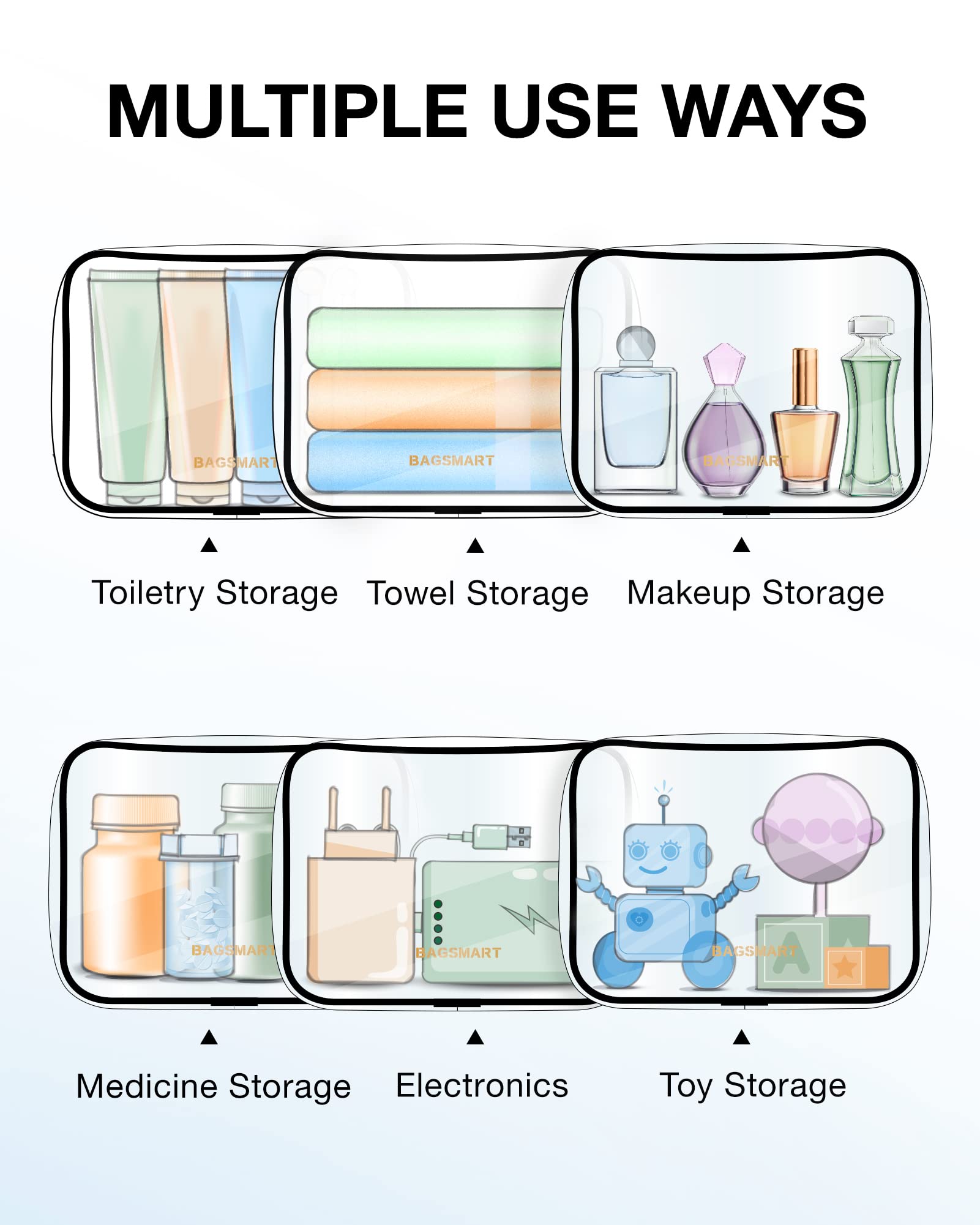 - Transparent for Easy Access: The clear travel bag with a large top opening allows for easy access to what you need; The two pack is perfect for accommodating different storage needs; It is suitable for travel bottles, as well as for storing cosmetics, toiletries, toys, and small items