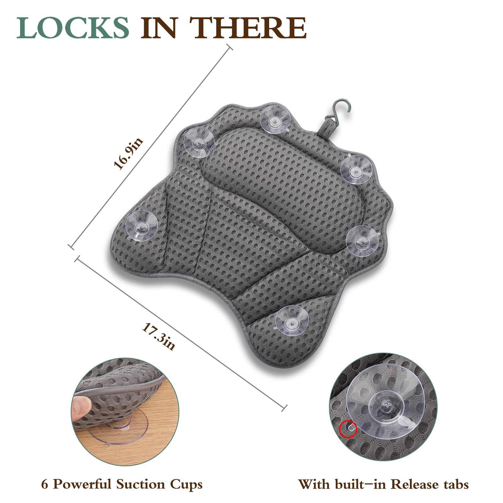 - đăPowerful suction cupsă Equipped with 6 powerful suction cups, which can prevent your tub pillow from sliding and moving normally.