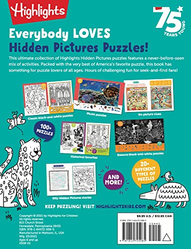 Details: Over 150,000 copies sold! Calling all junior detectives and super seekers! This engaging 144-page puzzle book celebrates the very best of Highlights Hidden Pictures puzzles. Kids will love searching for 1,500+ hidden objects in a variety of innovative seek-and-find puzzles, including full-color, photo and classic black-and-white scenes.