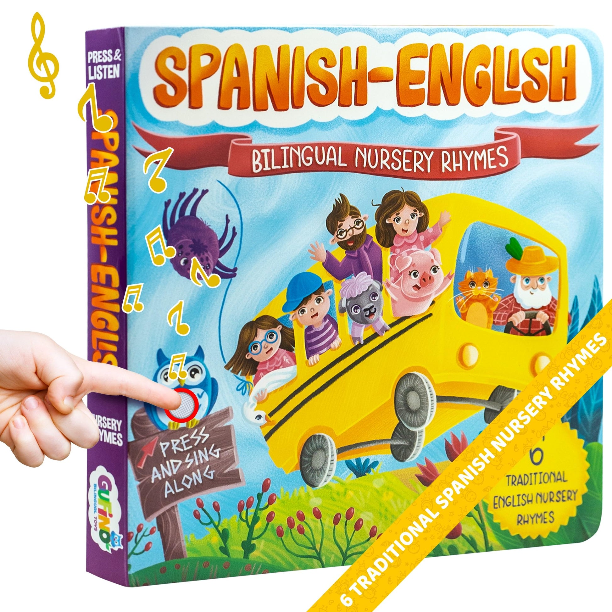 - Dive into learning with our bilingual baby books, including the classic 'wheels on the bus book' and other nursery rhyme books. Ideal for babies, this electronic soundbook is equipped with an On/Off button, ensuring the timeless songs are sung exactly in English and Spanish, promoting bilingual language development from the crib with these spanish books for kids 1-3.