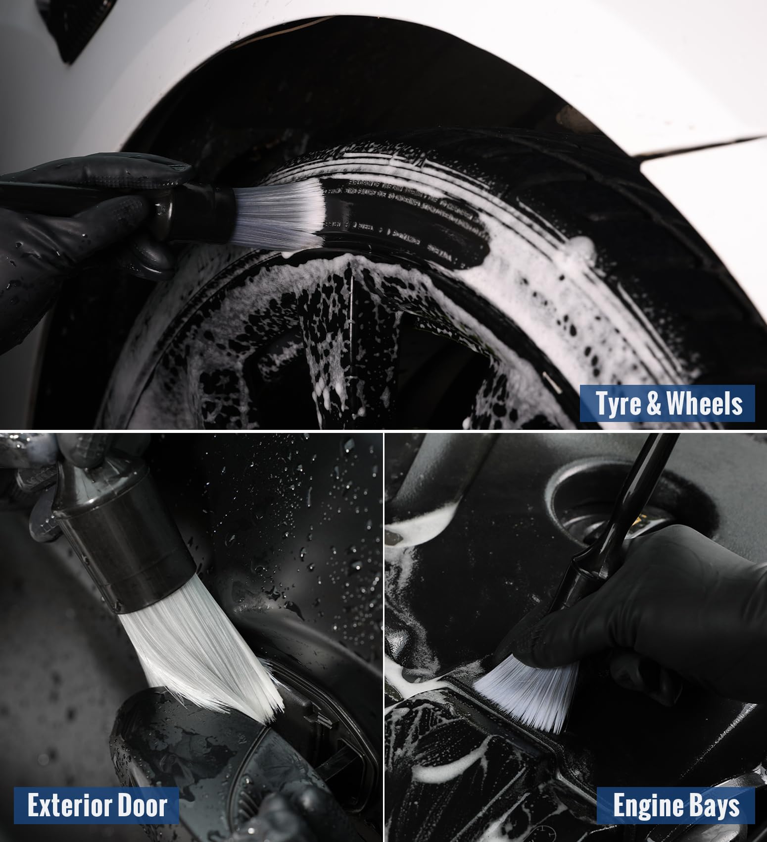 - [EXTERIOR & INTERIOR] The auto interior and exterior cleaner brushes work well for all the details. The smallest brush is ideal for keeping clean, and you can gently clean your car's interior accessories, keeping your vents, dashboards, etc., dust-free quickly. This brushes are awesome for cleaning bigger open areas, like dirty wheel faces, tires, engine bays, bumper, door jambs, grill. The brush size 9.05” is highly effective for cup holders, emblems, dashes, center consoles, exhaust tips, leather seats, and more.