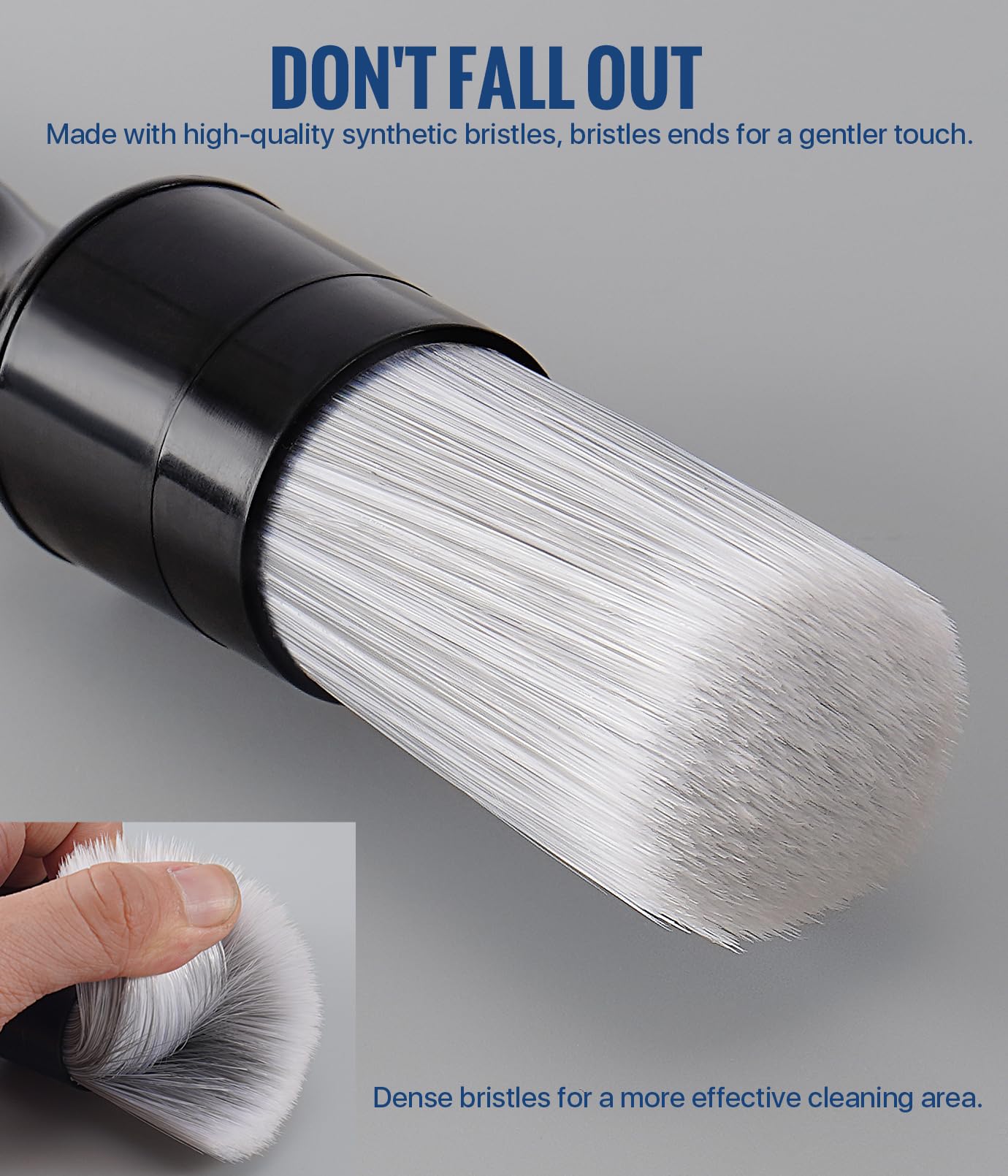 - [MATERIALS] The detailing brushes for vehicles are made with high-quality synthetic bristles, dense enough for a more effective cleaning area. After multiple uses, the bristles will not fall out. Ergonomically designed plastic water-resistant handle, sturdy and durable, unlike wood handles prone to damage.