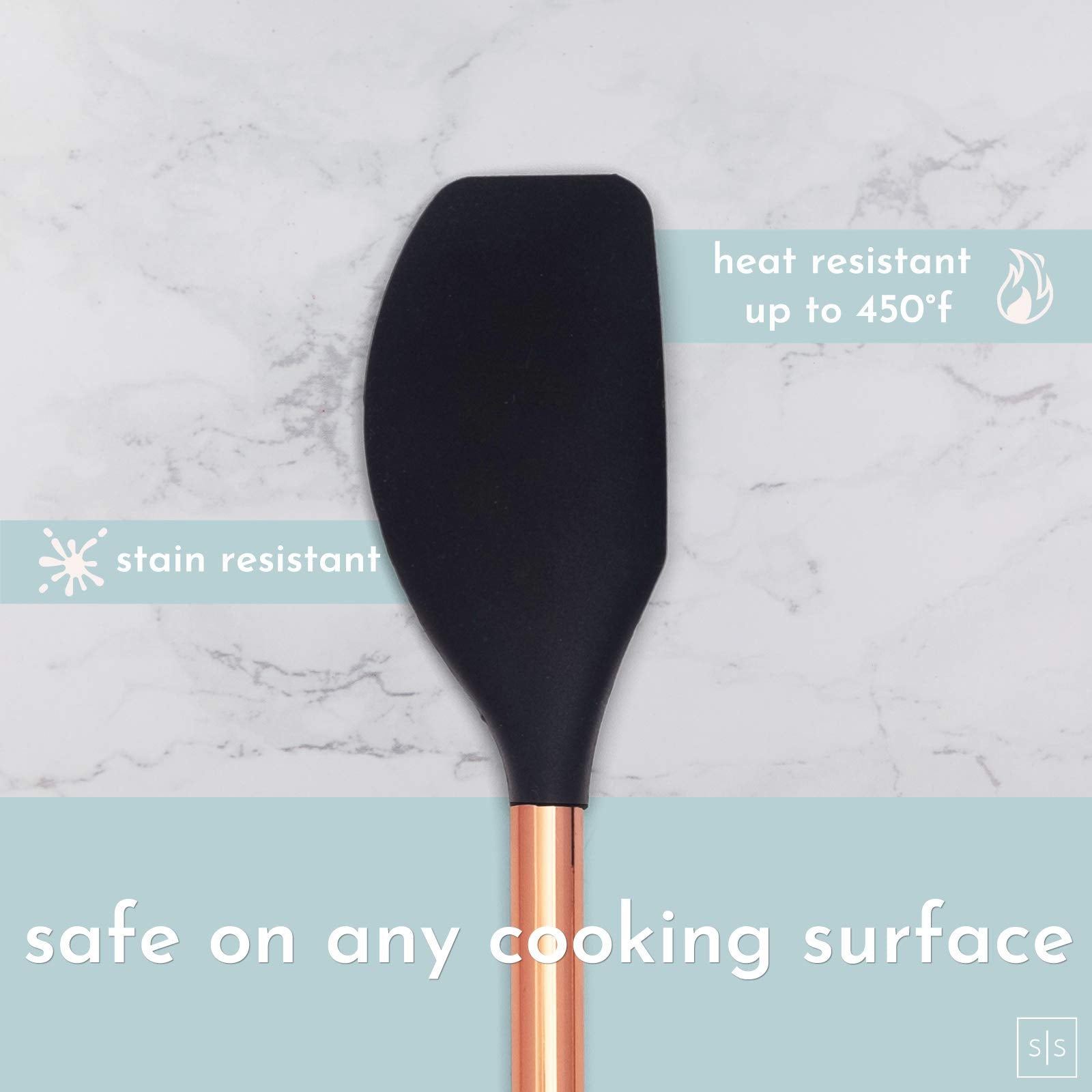 - ✔ LONG-LASTING AND DURABLE COPPER AND BLACK COOKING UTENSIL SET, – no more melting plastic or abrasive metal - protect and extend the life of your cookware with this easy to use black silicone utensil set; avoid scratches and scuffs on all your pots and pans, even non-stick, when cooking and serving with this versatile and heat-resistant rose gold utensils set.