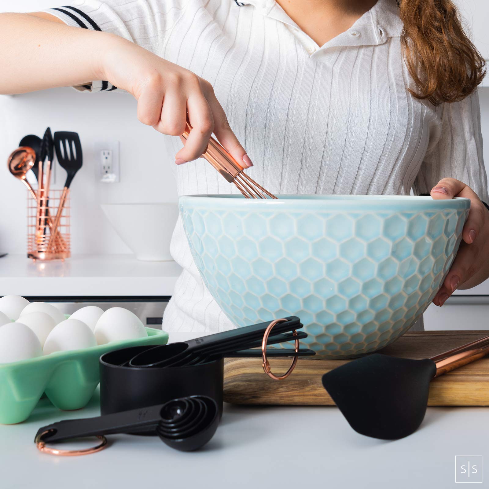 - ✔ CONVENIENT AND PRACTICAL STARTER SET – eliminate multiple purchases and mismatched utensils; outfit your kitchen with this complete and cohesive 17-PC set of stylish black and copper utensils set essentials; our black kitchen utensil set includes a black and copper spoon, copper tongs with silicone tip, rose gold ladle,silicone turner spatula, copper whisk, black spatula, black and copper measuring spoons and cups with matching copper utensil holder to complement your copper kitchen decor.
