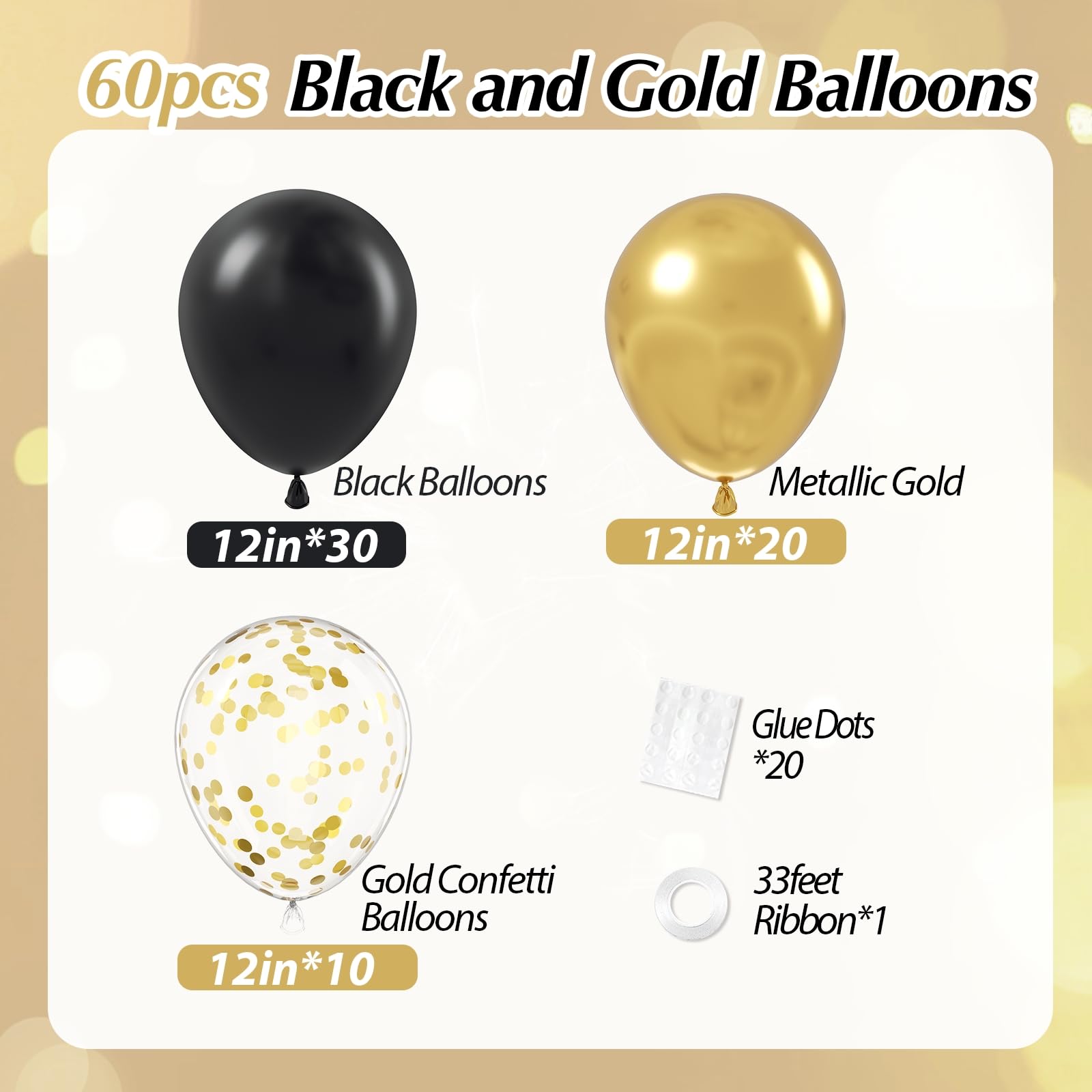 - Package Include: 12inch black balloons x30, 12inch metallic gold balloons x20, 12inch gold confetti balloons x10, ribbon x1, glue dotx20
