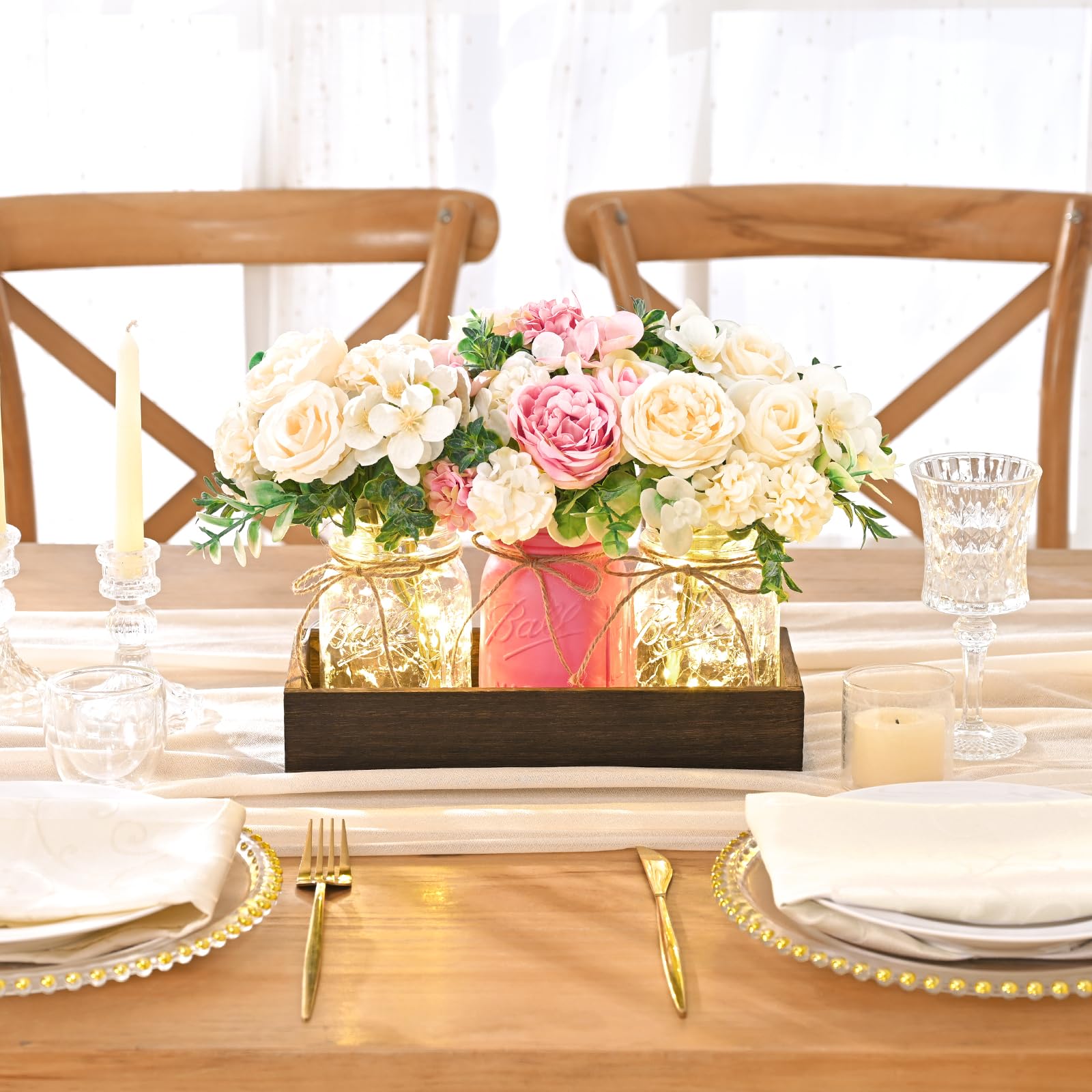 BLEUM CADE Centerpiece Table Decorations - 3Pcs Roses Artificial Flowers in Mason Jars with Wood Tray for Dining Table Coffee Table Farmhouse Home Decor