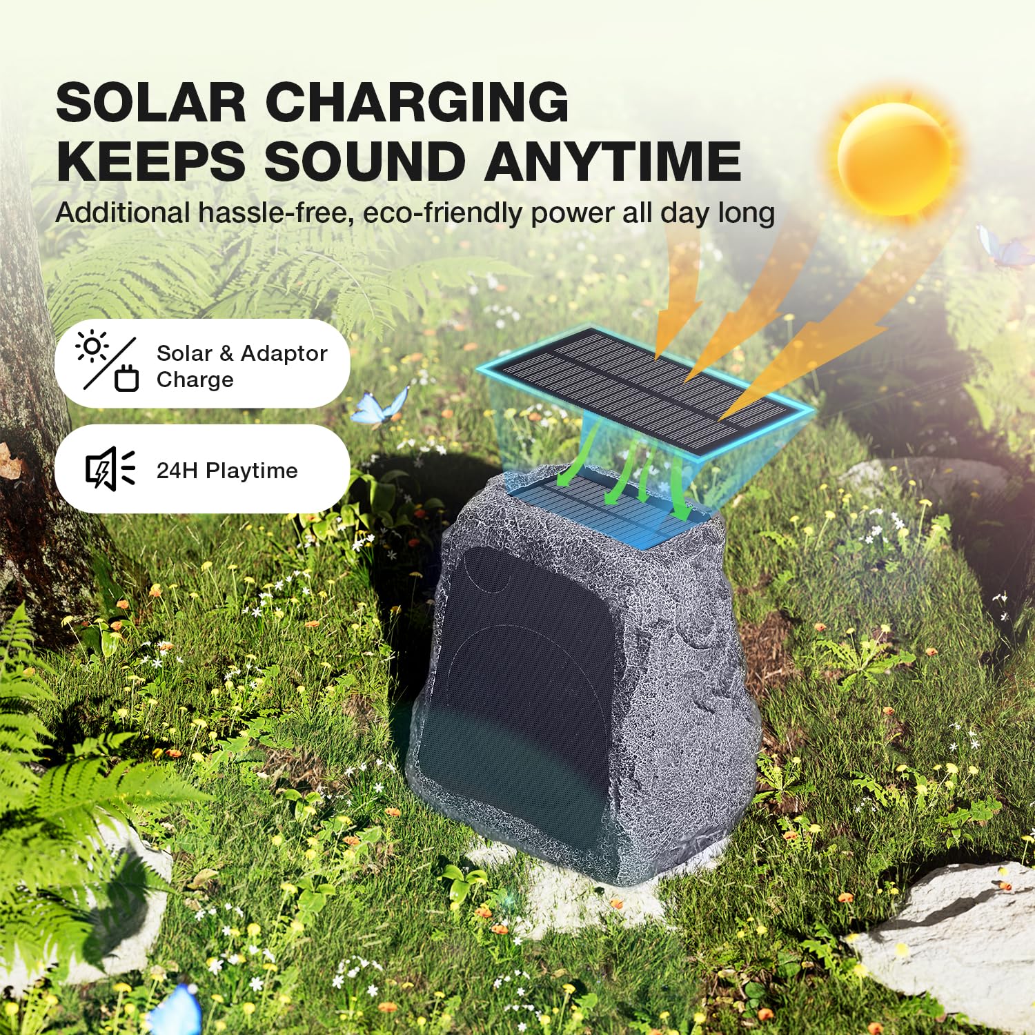 BlitzRock Outdoor Rock Speakers Wireless 80W Power Solar-Powered, 2 Drivers, Auto-Sync and Pair 100+ Speakers, IPX7 Waterproof, 24H Playtime Garden, Patio, Pool, Ideal for Music Entertainers - 2 Pack