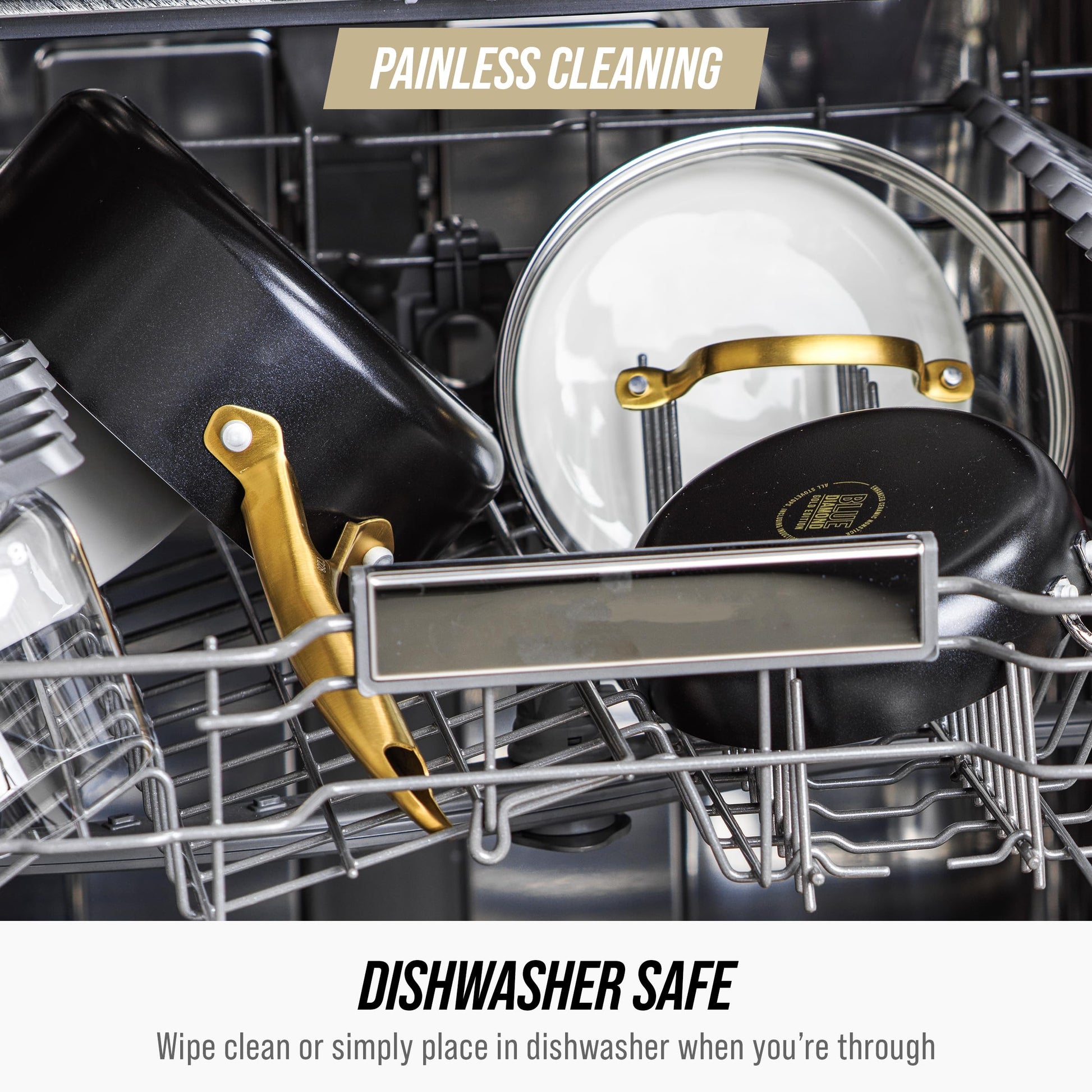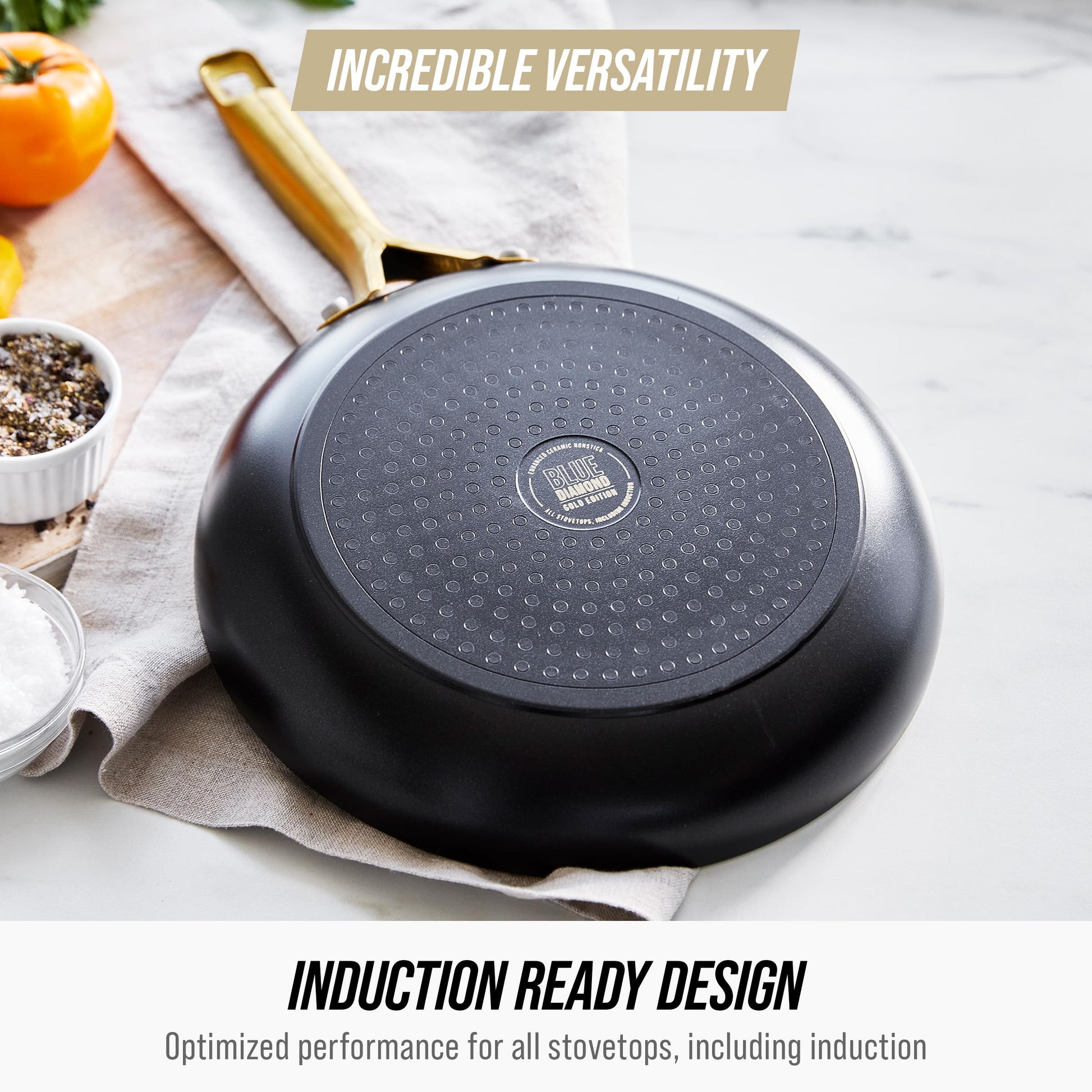 Details: Our latest shade of blue is gold! This 14-Piece Cookware Set from the Blue Diamond Gold Collection features our radical reinvention of nonstick cooking delivering incomparable release, ultra-fast heating, and incredible results. Our gold-diamond infused ceramic nonstick coating delivers daily durability and is made without PFAS for healthier, worry-free meals. The eye-catching gold-tone stainless steel handles are finished in wear-and corrosion-resistant coating for a shine that lasts through endless meals. Plus, each pan in this collection features induction ready bases for optimal heating on any stovetop. Simply place Blue Diamond Gold in the dishwasher for a hassle-free cleanup.