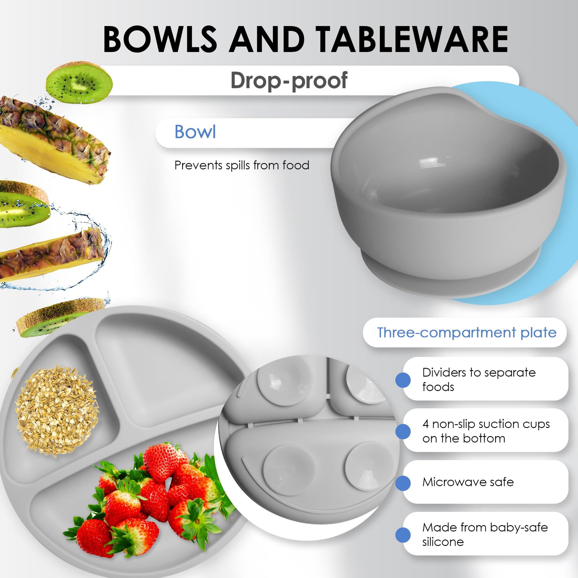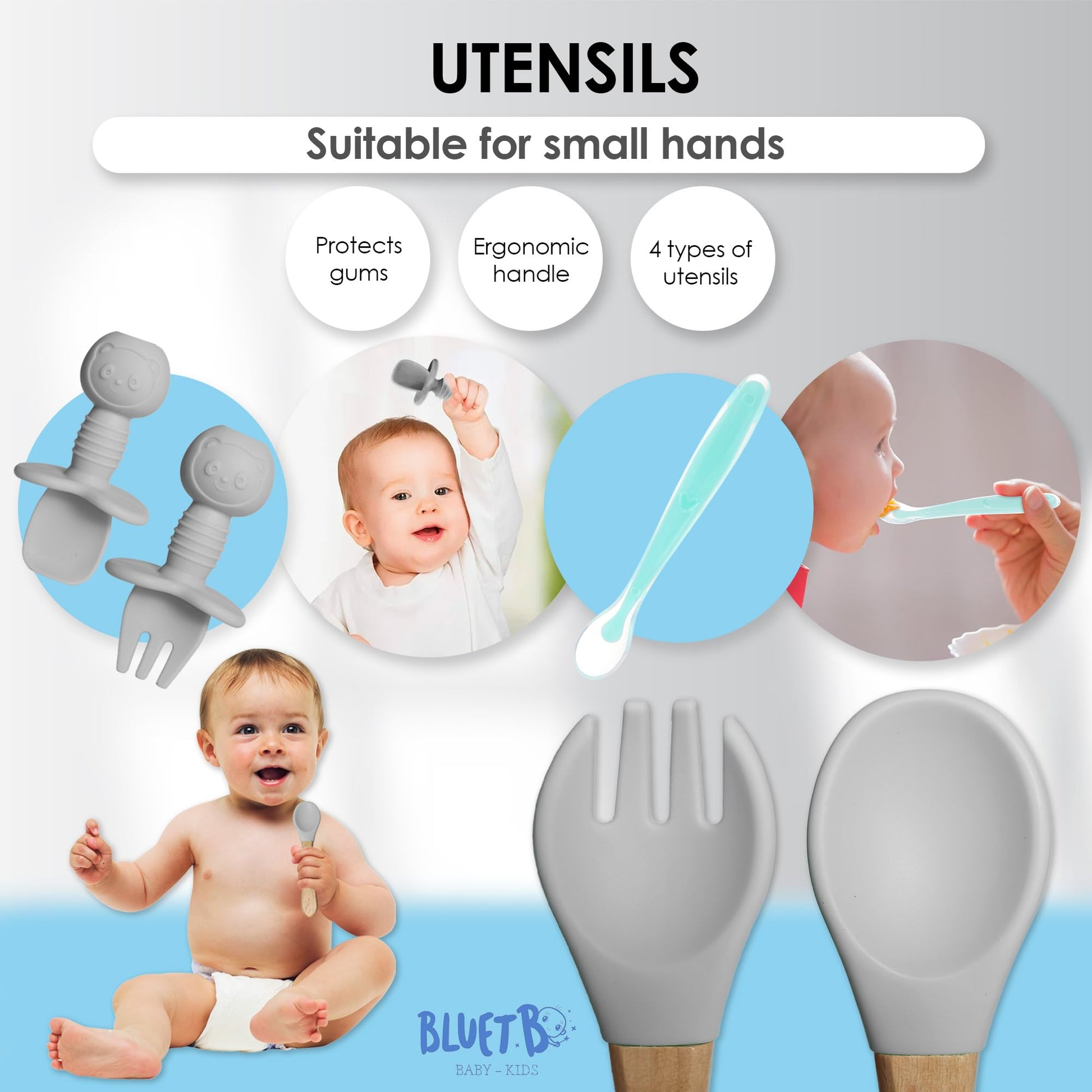 Bluet B- Silicone Baby Feeding Set with Pacifier - Baby Led Weaning Supplies - Baby Spoons, Suction Bowl - Plate - Baby Utensils Set - Silicone Feeding Set for Baby First Foods - 11pcs - Gray