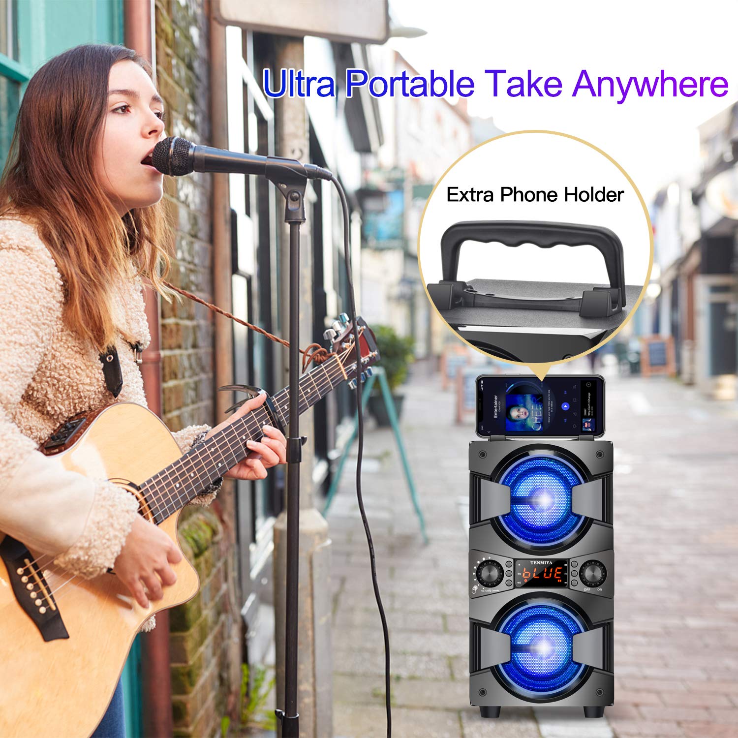 - đ¶ ăBluetooth Speakers with Subwooferăâ More Features â 1: Bluetooth speaker with FM radio; 2: Karaoke machine - Bluetooth speaker with microphone; 3: Bluetooth speaker with lights; 4: Support AUX,USB,TF card three ways to play; 5: USB connectivity to record your performance or to play your saved songs; 6: Great customer service, if you have any questions, please send us an email.We will check our mailbox every day to answer your questions and solve them.