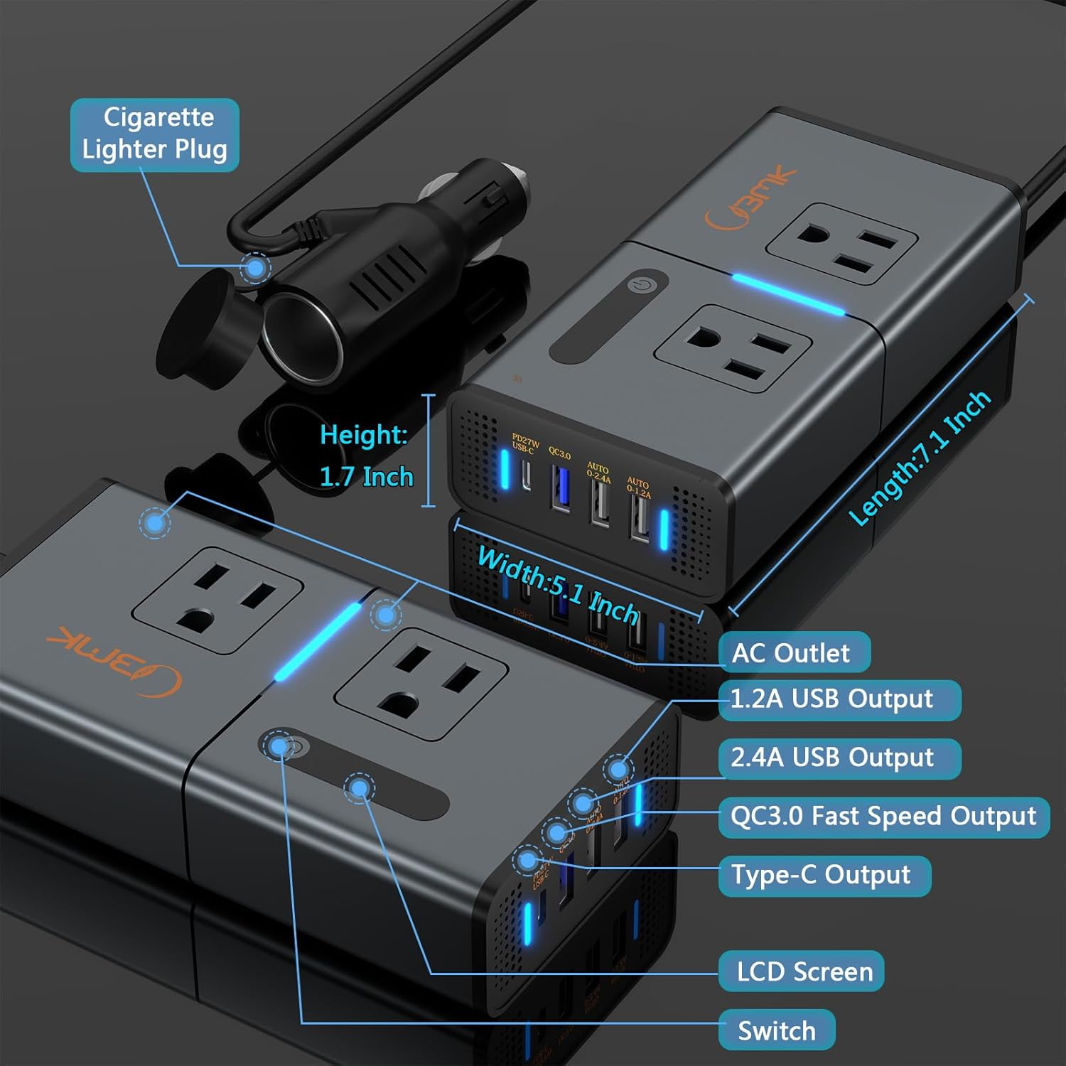 BMK 200W Car Power Inverter Newly Car Plug Adapter Outlet Charger DC 12V to 110V Car Inverter with 1.2A&2.4A USB, 1 QC3.0 USB and 1 Type C Ports Black