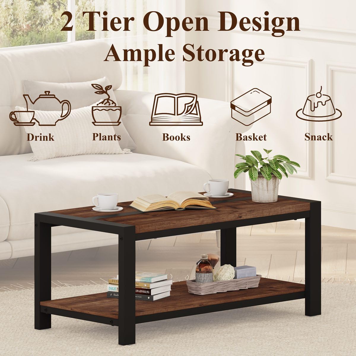 - Solid Coffee Table - Whether it's a cozy coffee break or shared moments with friends, this modern coffee table effortlessly enhances your living experience. It features heavy-duty metal frames and a chunky tabletop with a weight capacity of up to 400 lbs. The two-tier shelf offers ample space for your daily supplies. The rustic wood grain also adds farmhouse charm to your space. It's a valuable addition to spaces like the living room, apartments and dorms.