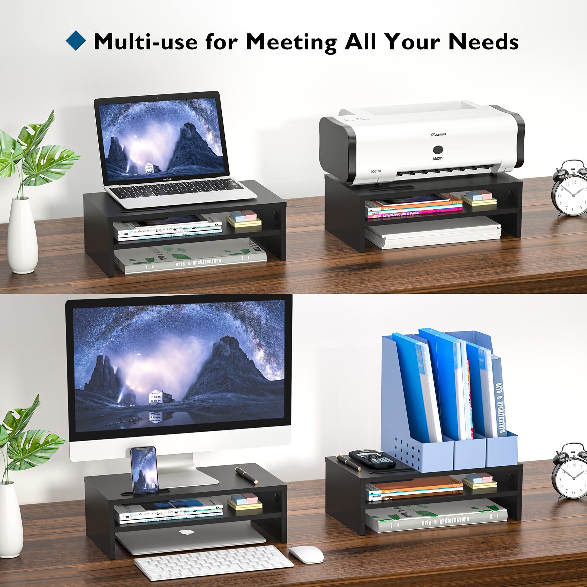 - MONITOR STAND WITH STORAGE ORGANIZATION FEATURES - This two-tier monitor stand provides ample storage for your laptop, keyboard, mouse, and other accessories. The built-in cellphone holder and cable management slots help keep your desk tidy and organized