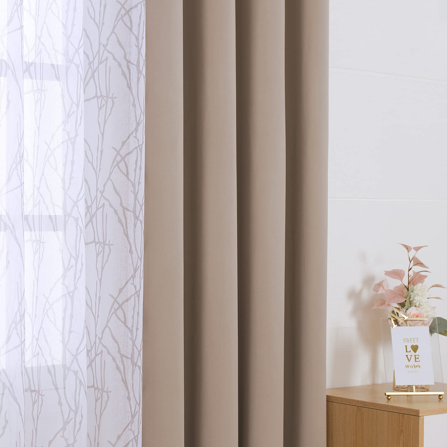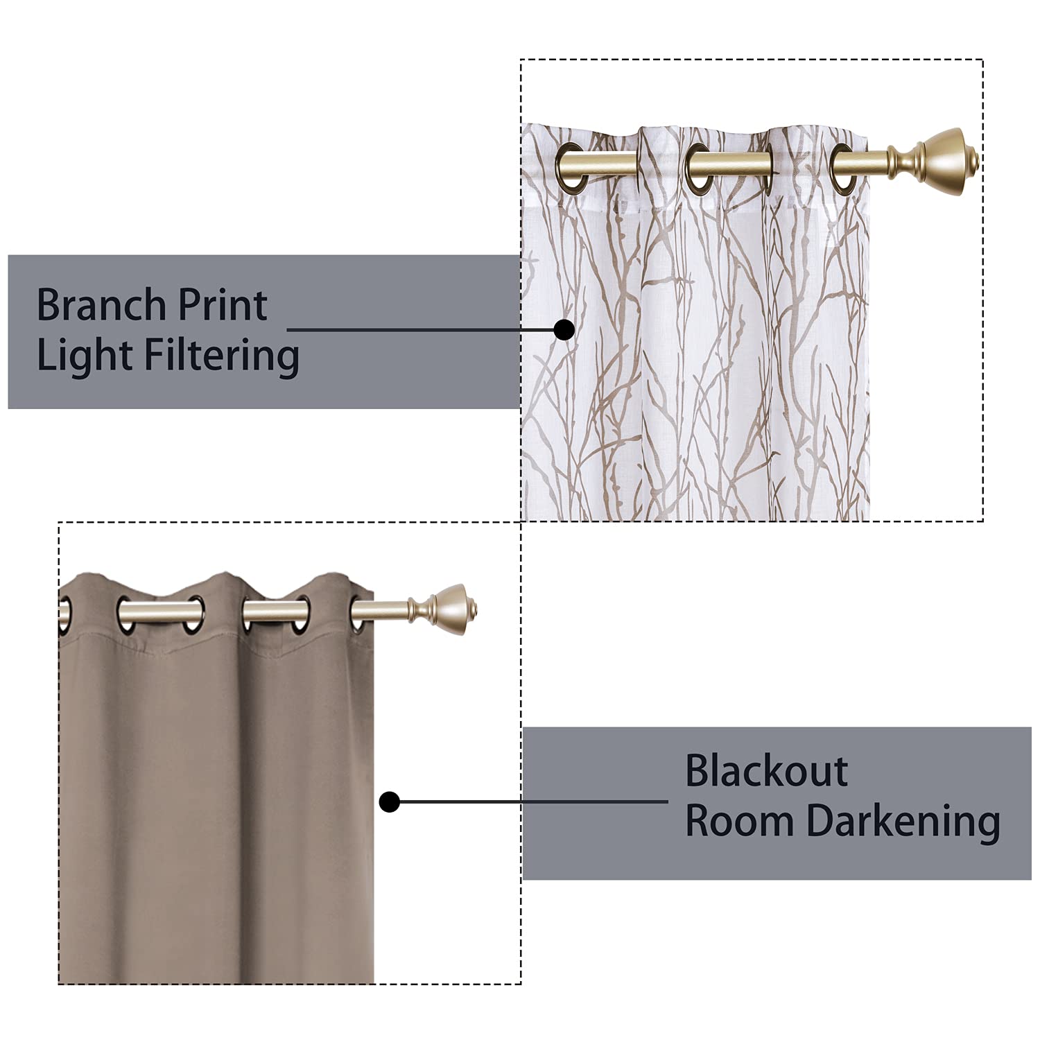 BONZER Mix and Match Curtains - 2 Pieces Branch Print Sheer Curtains and 2 Pieces Blackout Curtains for Bedroom Living Room Grommet Window Drapes, 54x84 Inch/Panel, Taupe, Set of 4 Panels