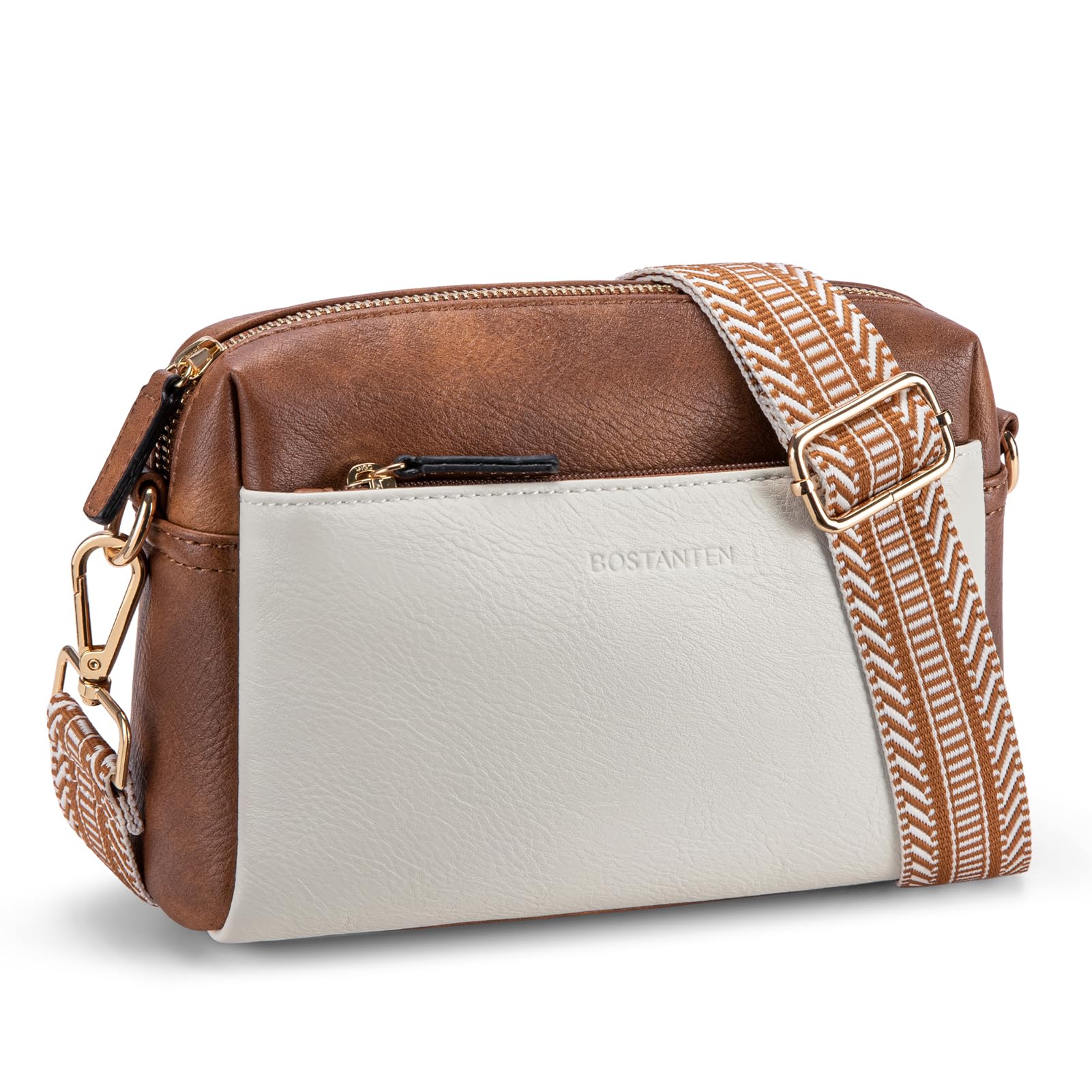 BOSTANTEN Small Crossbody Purse for Women Triple Zip Cell Phone Leather Shoulder Handbag with Wide Guitar Strap Beige with Brown