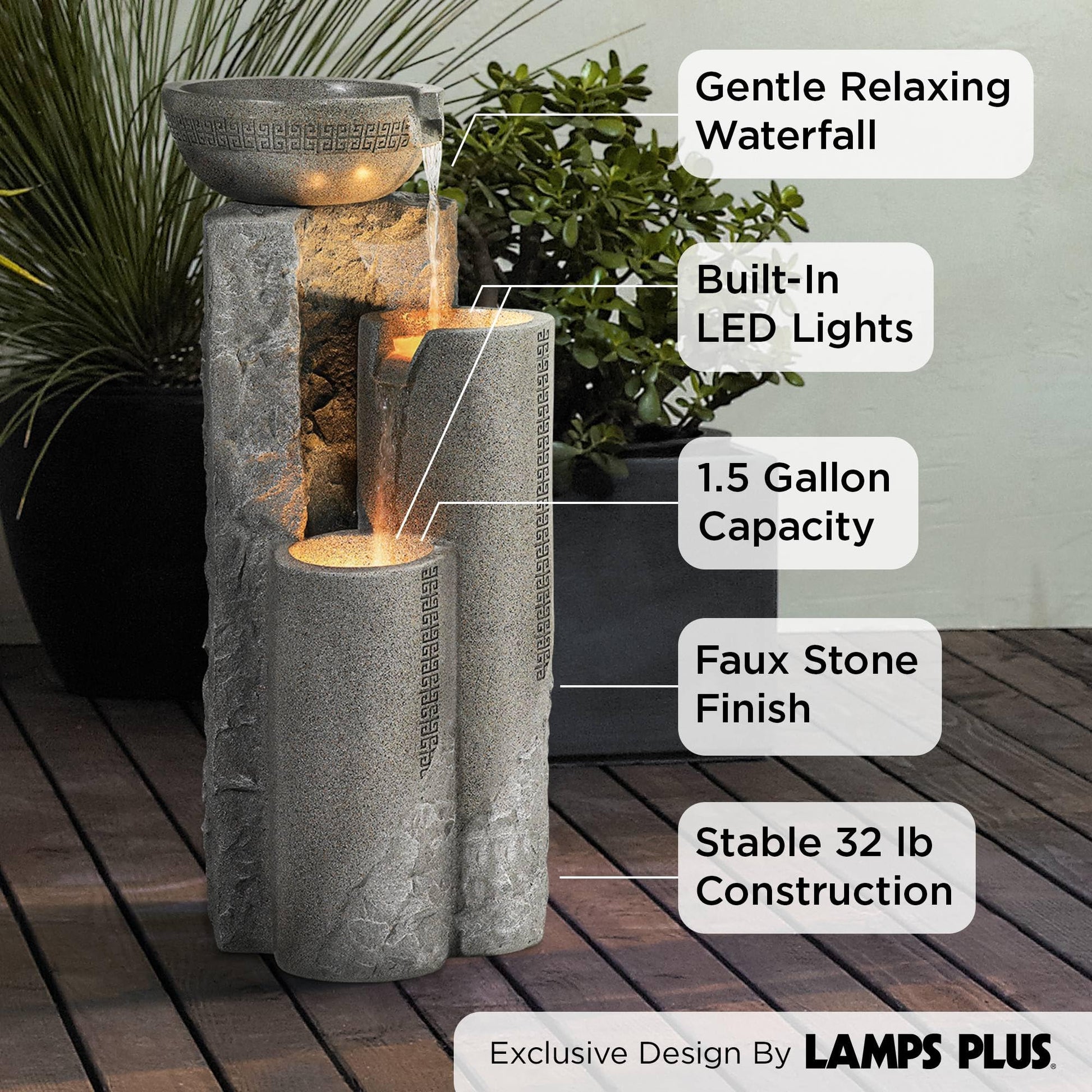 - 【Create a tranquil outdoor retreat】Add a freestanding garden water fountain or outdoor garden fountain to your front yard or zen garden for an elegant outdoor water feature. Its modern design, complete with a light, offers a lighted cascading effect that blends beauty with the soothing sound of a water fall.