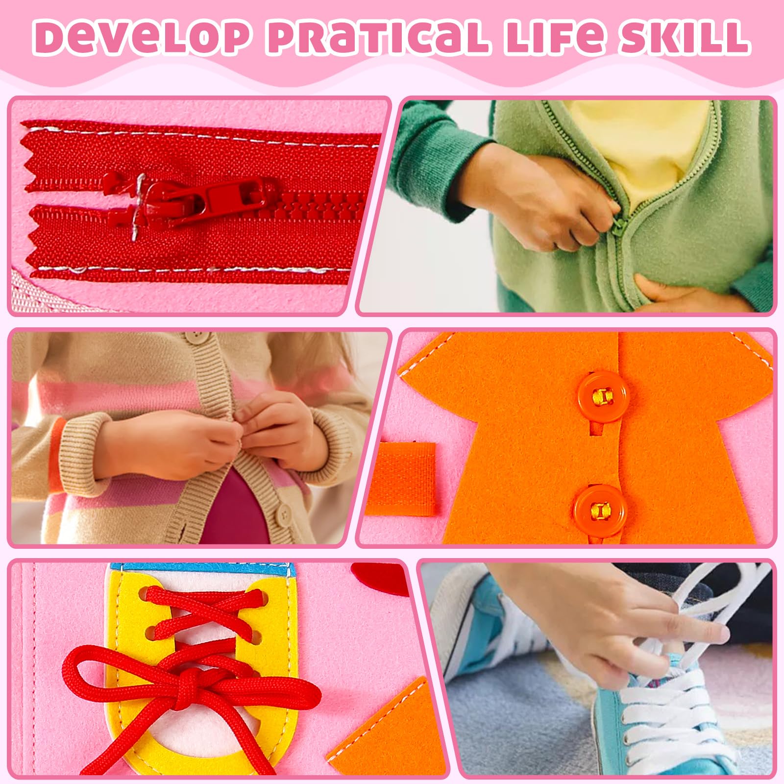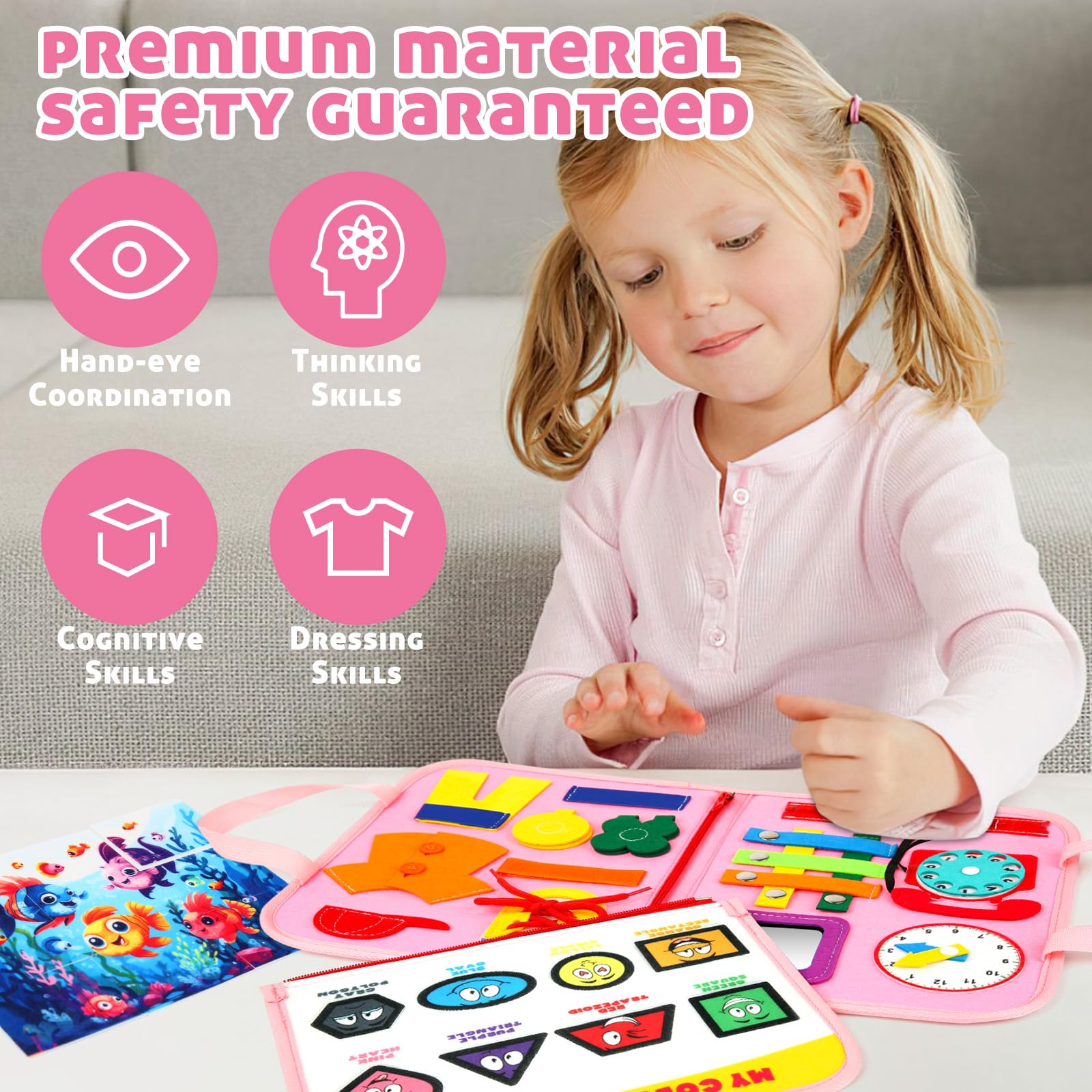 - 【SAFE AND DURABLE PRESCHOOL TOYS】For the safety of toddlers, our montessori toys for 1-4 years old toddlers are made of non-toxic and durable felt material, with no sharp edges around them, which won't hurt your baby's little hands. All the parts on the busy board are firmly bound, not easy to fall off and durable. In this regard, sensory learning educational toy no harm to the skin and no peculiar smell. Keep your child busy and safe at the same time, and you can enjoy your time to the fullest!