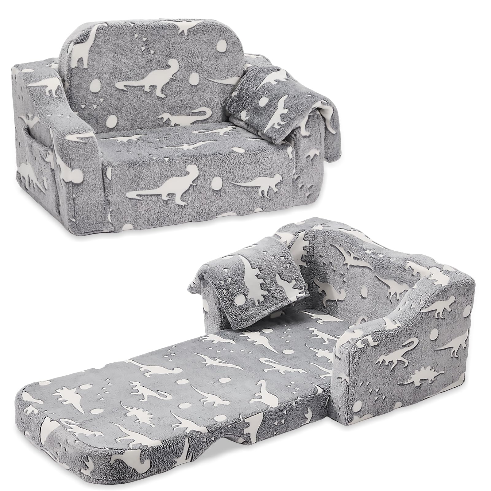 BUPPLEE Kids Sofa, 2-in-1 Soft Toddler Couch Fold Out, Toddler Chair Comfy with Cute Designs, Convertible Sofa to Lounger for Girls and Boys, Gray