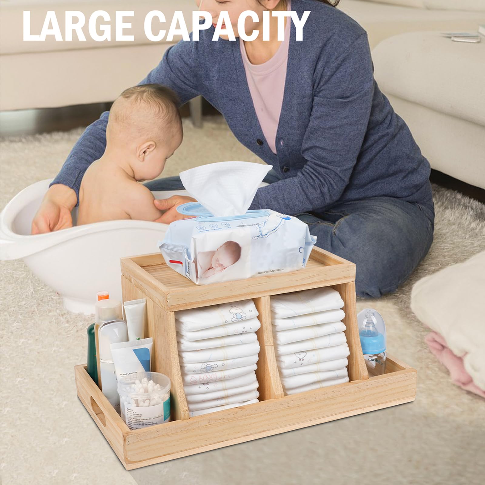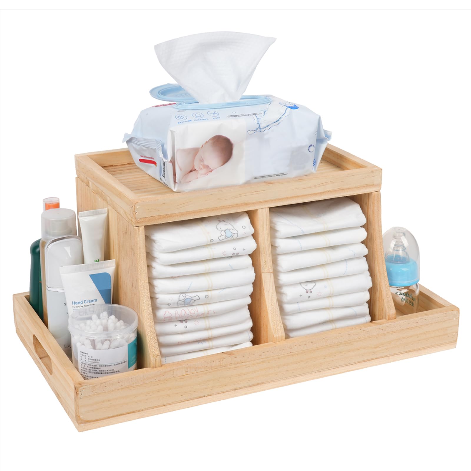 - Multifunctional Diaper Organizer: The diaper caddy features multiple compartments to store diapers, wipes and all diaper changing supplies together. Its main compartment can hold up to 26 diapers. You can quickly find the changing supplies