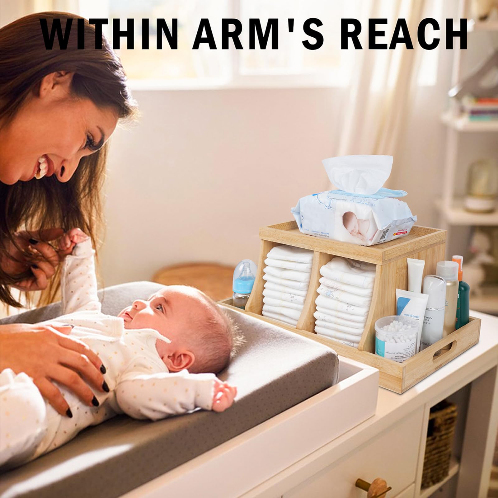 - Nursery Organization: The diaper organizer for changing table keeps all baby changing essentials neatly organized and within easy reach. When changing diaper, you can keep one hand on your baby and easily reach the baby supplies with the other hand