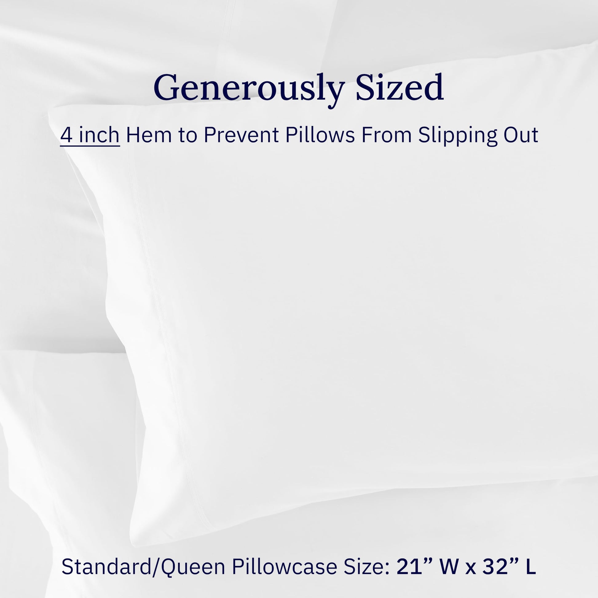 - SECURE FIT THAT SLIDES EASILY ONTO YOUR PILLOWS: It’s a match! Our two-piece white standard/queen pillowcases set (21' W x 32' L) fit the pillows between 20' W to 26' - 30' L. The pillowcases standard set of 2 is roomy and slip in easily. The 4-inch gorgeous hem ensures the pillows are tucked in for a neat look. Complete the look with our 600 TC sheet set that complements any room decor and lends elegance to it.