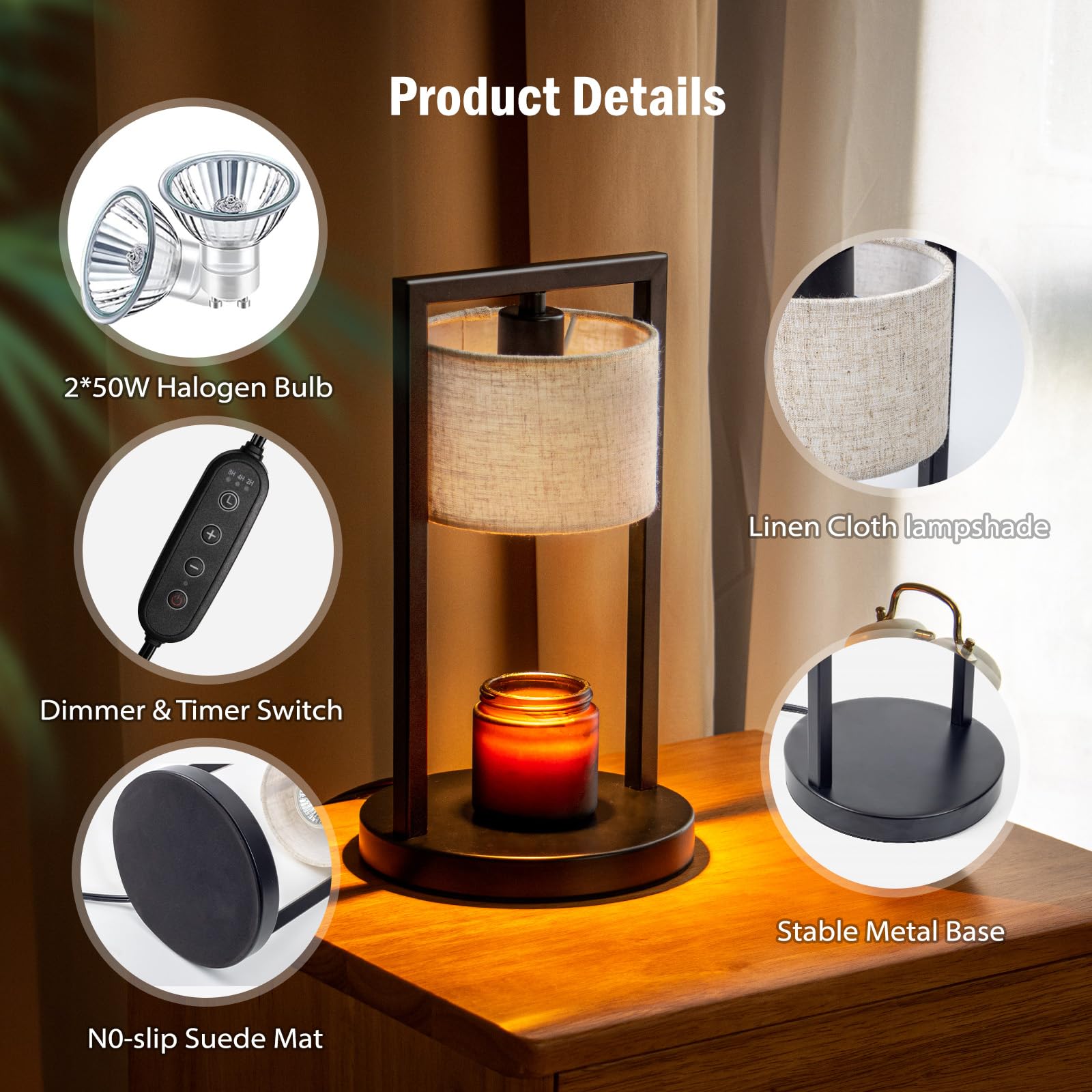 - Safer Candle Warmer with Timer: With a 50-watt halogen warming bulbs, no open flame, no smokem and reducing fire risk. Create you a private comfortable bedroom with the smell of candle what you like. Moreover, Use the timer (2H/4H/8H) to automatically turn off the lamp after your desired duration, ensuring safety and energy efficiency. And the whole metal body and base with anti-slip pads provide more safey and Stability