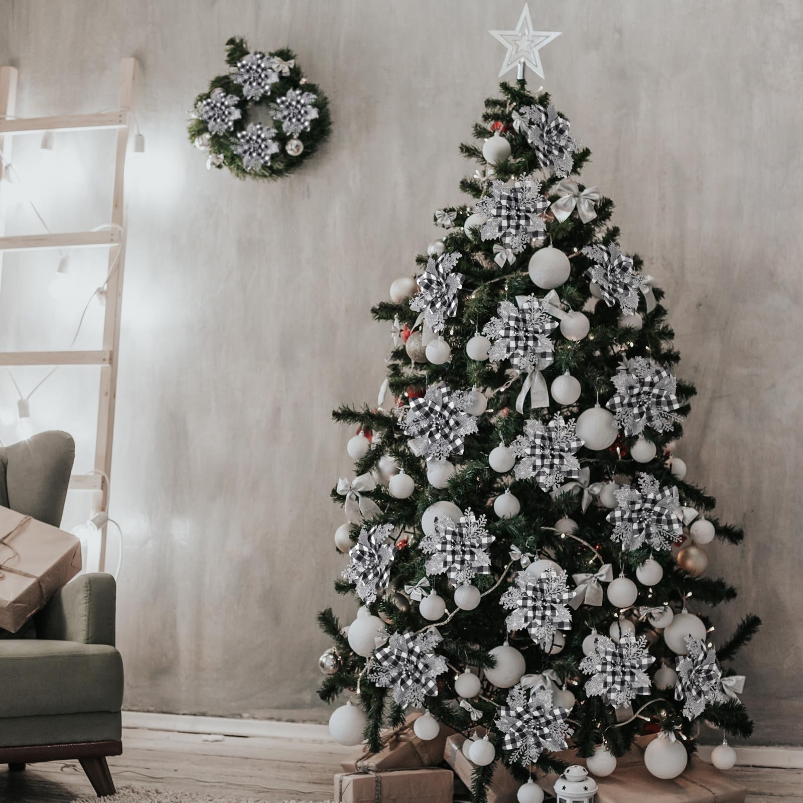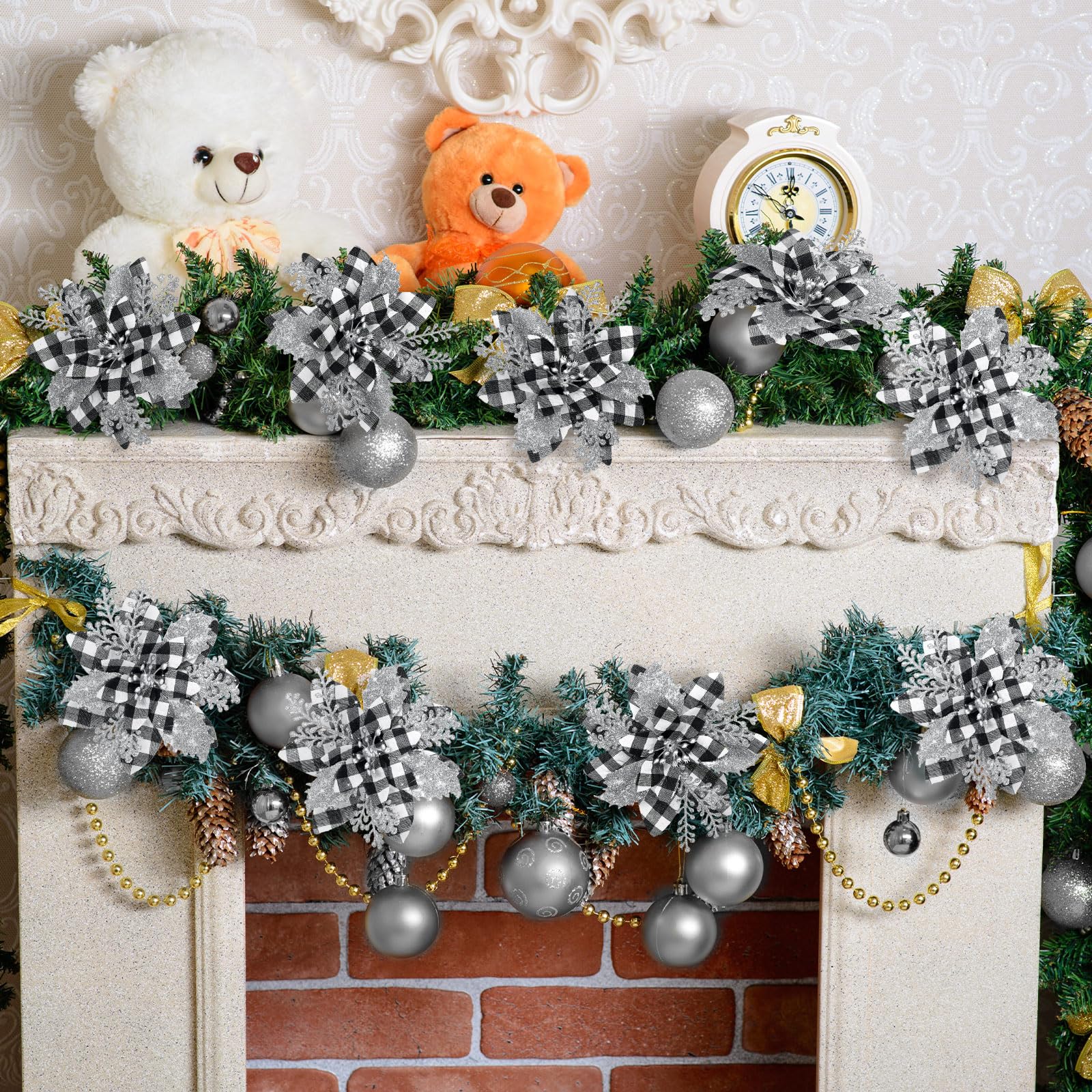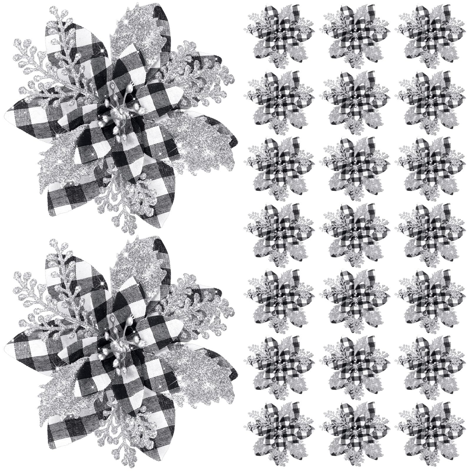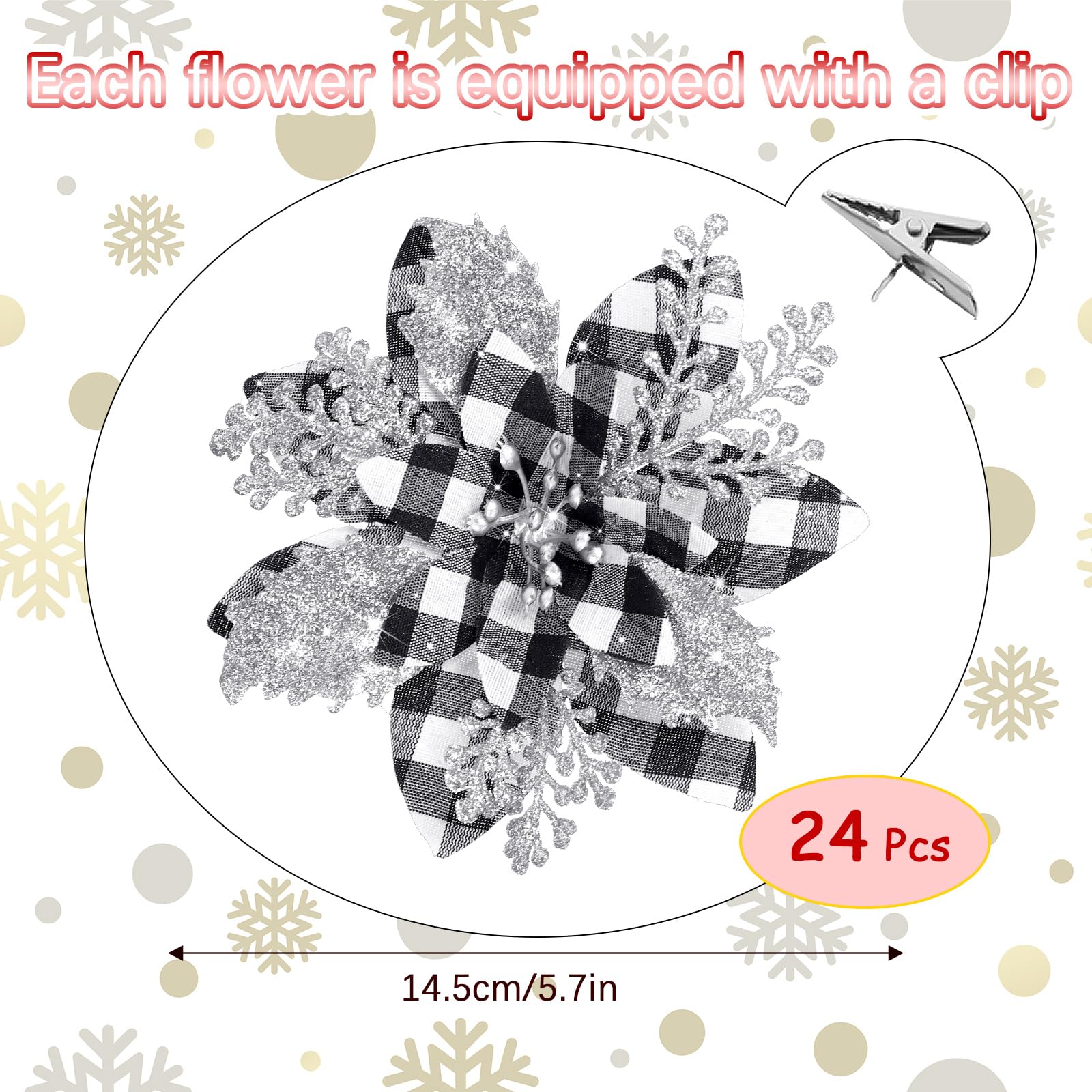Canlierr 5.7 Inch Artificial Poinsettias Christmas Glitter Flowers with Clips Xmas Tree Flower Ornament Poinsettias Decor (Black and White Buffalo with Silver Petals,24 Pieces)