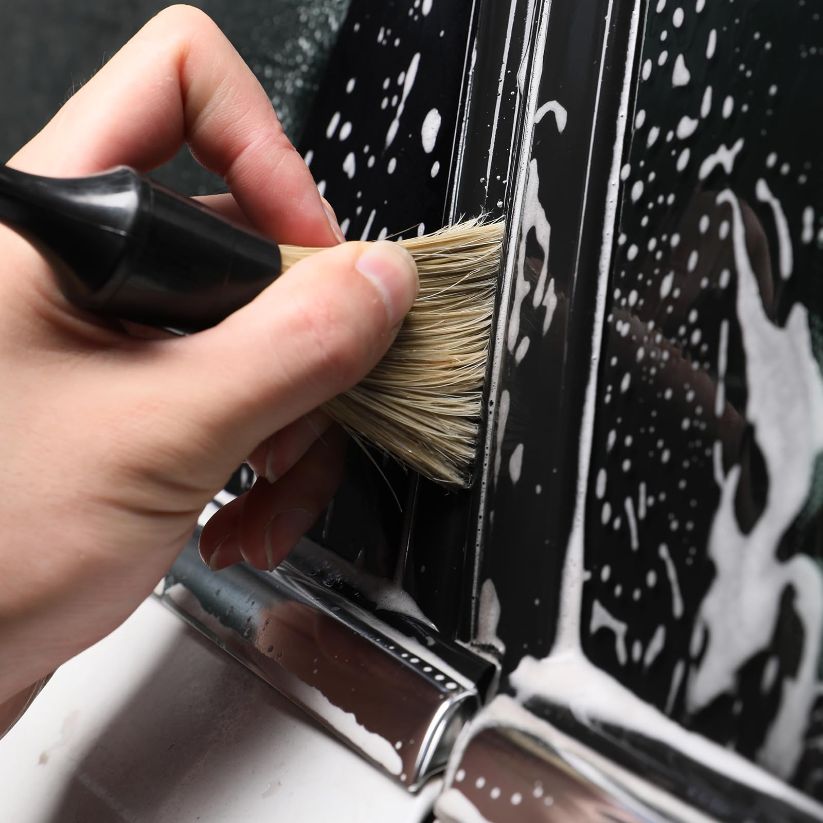 - PREFECT DETAILING BRUSH SET FOR VEHICLES - The double headed ultra- soft brush for cleaning exquisite surfaces like dashboard, center console, screen, cleaning air vents, genuine leather seats etc. The three size boars hair bristle engine brush is suitable for stubborn dirt cleaning both car interior and exterior, such as scuff plate, lug nuts, wheel, tire, engine bay cleaning, long enough for lug nuts, narrow or tight space.