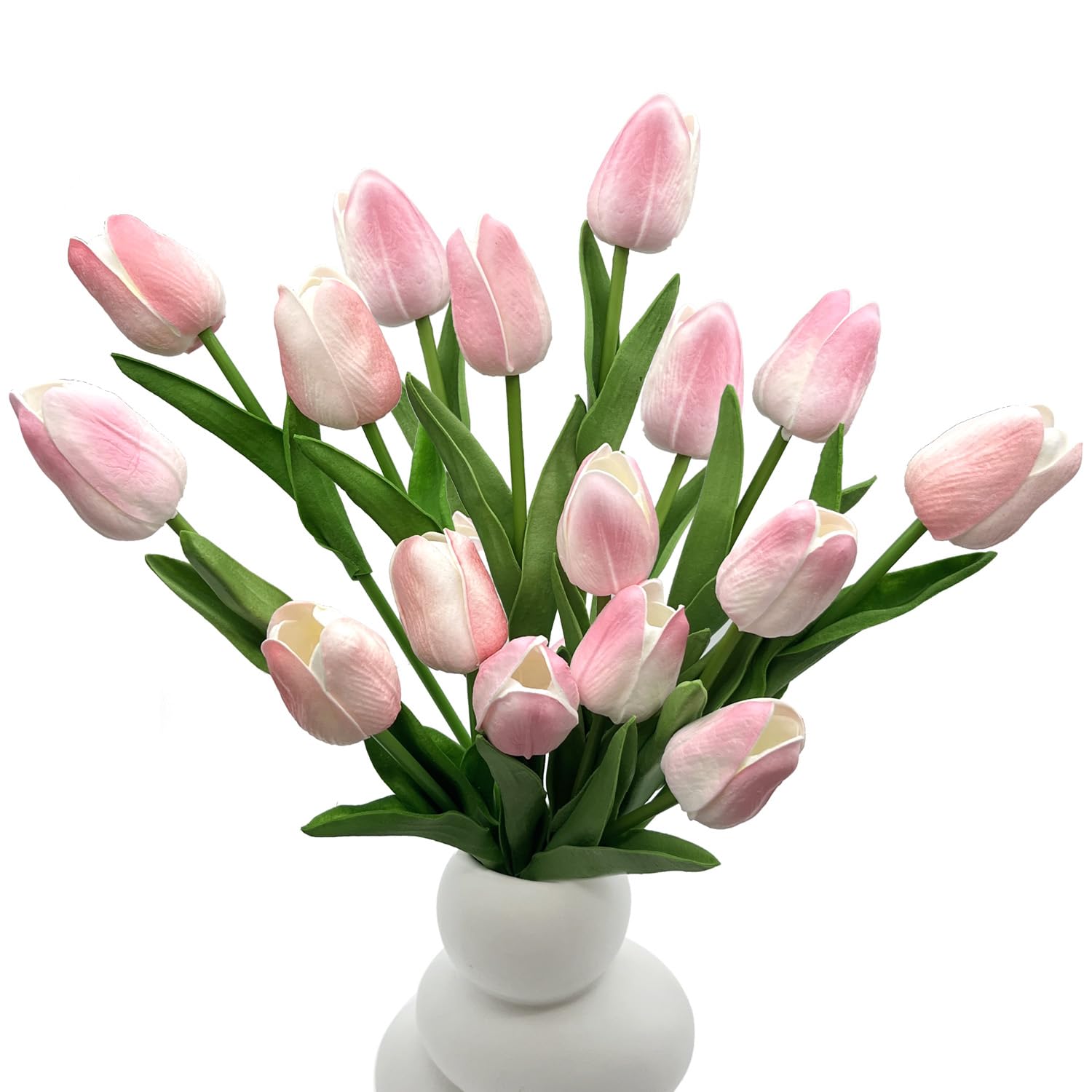 - Artificial tulip size: The faux tulips size is 13 inches /33 cm. Bud width: 1.38 inches /3.5 cm, bud height: 2 inches /5 cm. Package includes 16Pcs Tulips Artificial Flowers Faux Tulip Stems Real Feel PU Tulips. These are individual stems, easy to arrange. You can use them alone in single stem flowers or in combinations.( Vases are not included)