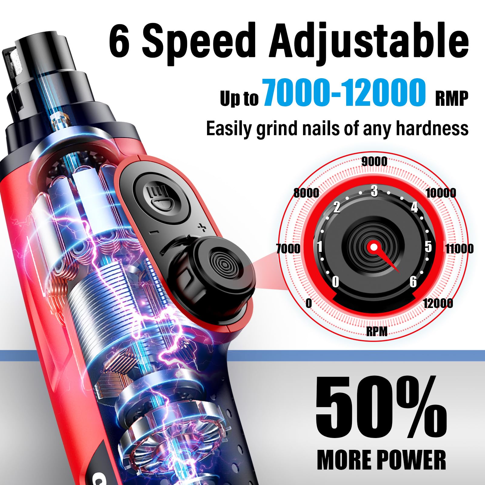 - 【Adjustable 6 Speeds for Perfect Precision】 With speeds from 7000 to 12000 RPM, the Casfuy electric dog nail file is one of the most powerful on the market. It offers 6 speed levels, each featuring 9 variable power settings. The smart optimization ensures that every speed delivers the ideal power for small, medium, and large pets’ nail care. Experience the perfect blend of power and precision.