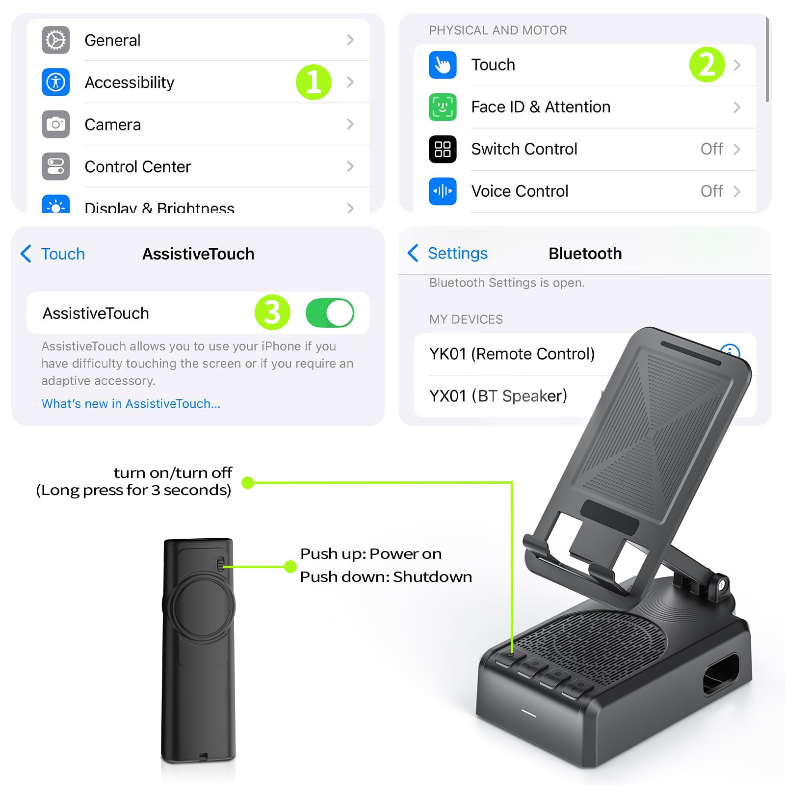 - Wide Compatibility: This Bluetooth speaker phone stand is easy to use and compatible with smartphones of various sizes. It supports iPads and other 4-13 inch devices (with thickness < 2.5cm), including e-readers, Nintendo Switch, and more 4-13 inch devices. The remote control is compatible with Samsung, iPhone, iPad and tablets.For iOS users:Navigate to 'Settings' > 'Accessibility' > 'Touch' > enable 'AssistiveTouch' for full functionality.