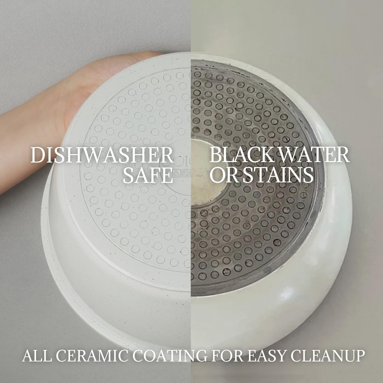 - Make Cleanup a Breeze- With innovative dual-sided coating design, our ceramic cookware set allows food residue to slide off with just an effortless wipe. The ceramic coating on the bottom makes cleanup much easier with simple wipes.It is also dishwasher-safe to free your hands after cooking