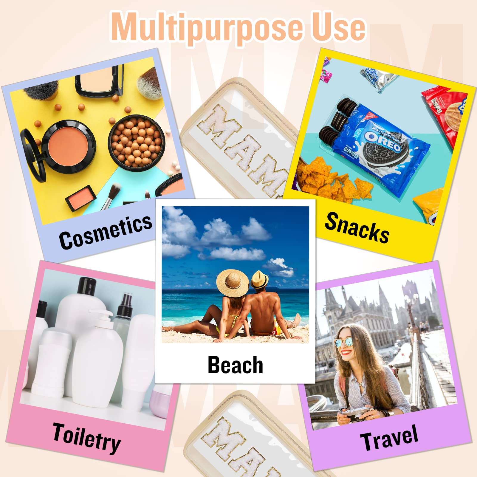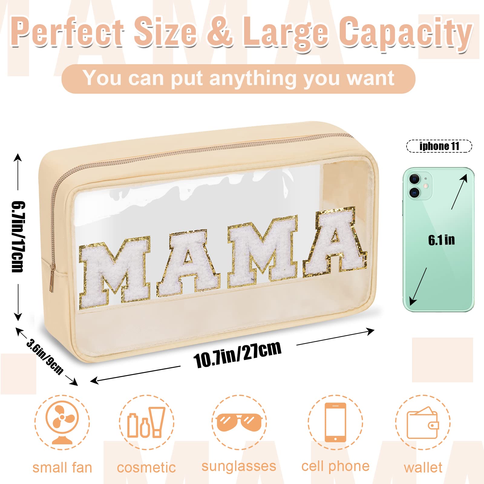 Chenille Letter Clear Makeup Bags Mama Pouch, Preppy Patch Makeup Bag with Zipper, Transparent PVC & Nylon Waterproof Portable Glitter Cosmetic Bag Travel Toiletry Storage for Women Girls(MAMA-Beige)