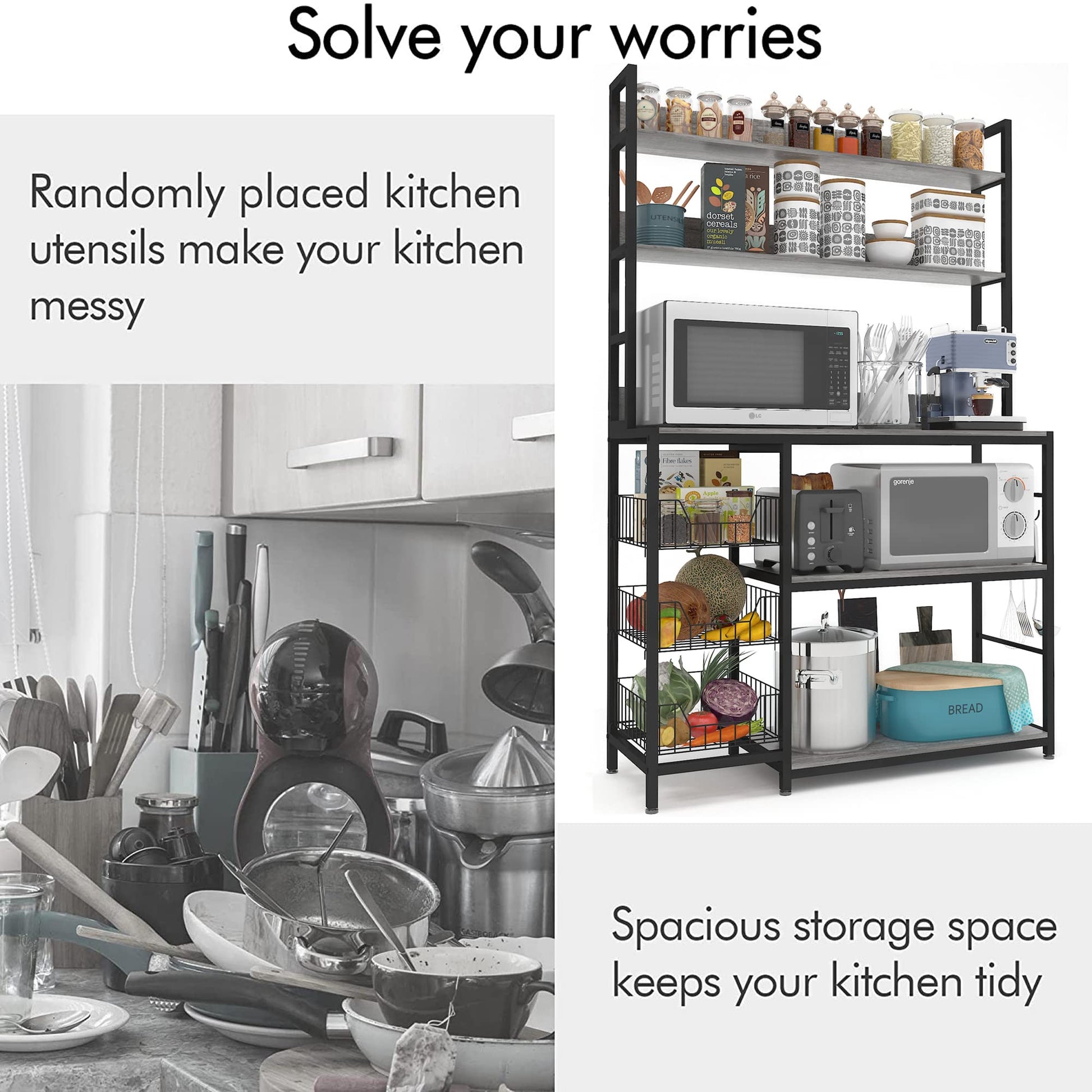 Chnnmbrn Kitchen Bakers Rack with Baskets,Free Standing Shelf,5-Tier Kitchen Utility Storage Shelf with Hooks, Microwave Oven Stand Rack Grey