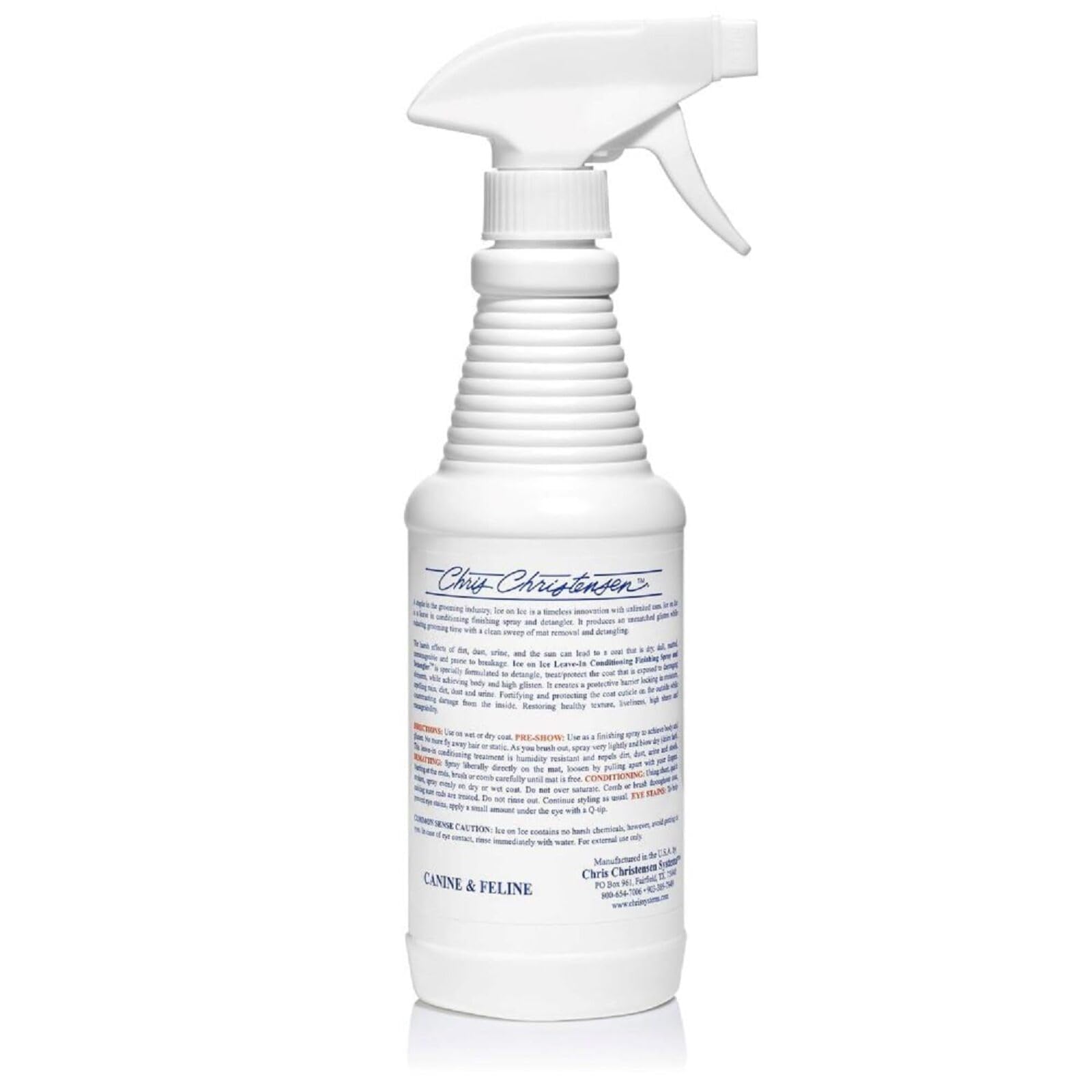 - ALL COAT TYPES – Chris Christensen Ice on Ice Detangling and Finishing Spray can be used on all coat types and breeds, including doodles. Choose from Ready to Use spray or Concentrated Formula – dilute 16:1 to make two gallons and apply with a mister. Concentrated Formula is water soluble and can be added to the final rinse for a truly beautiful coat. Made in the USA.