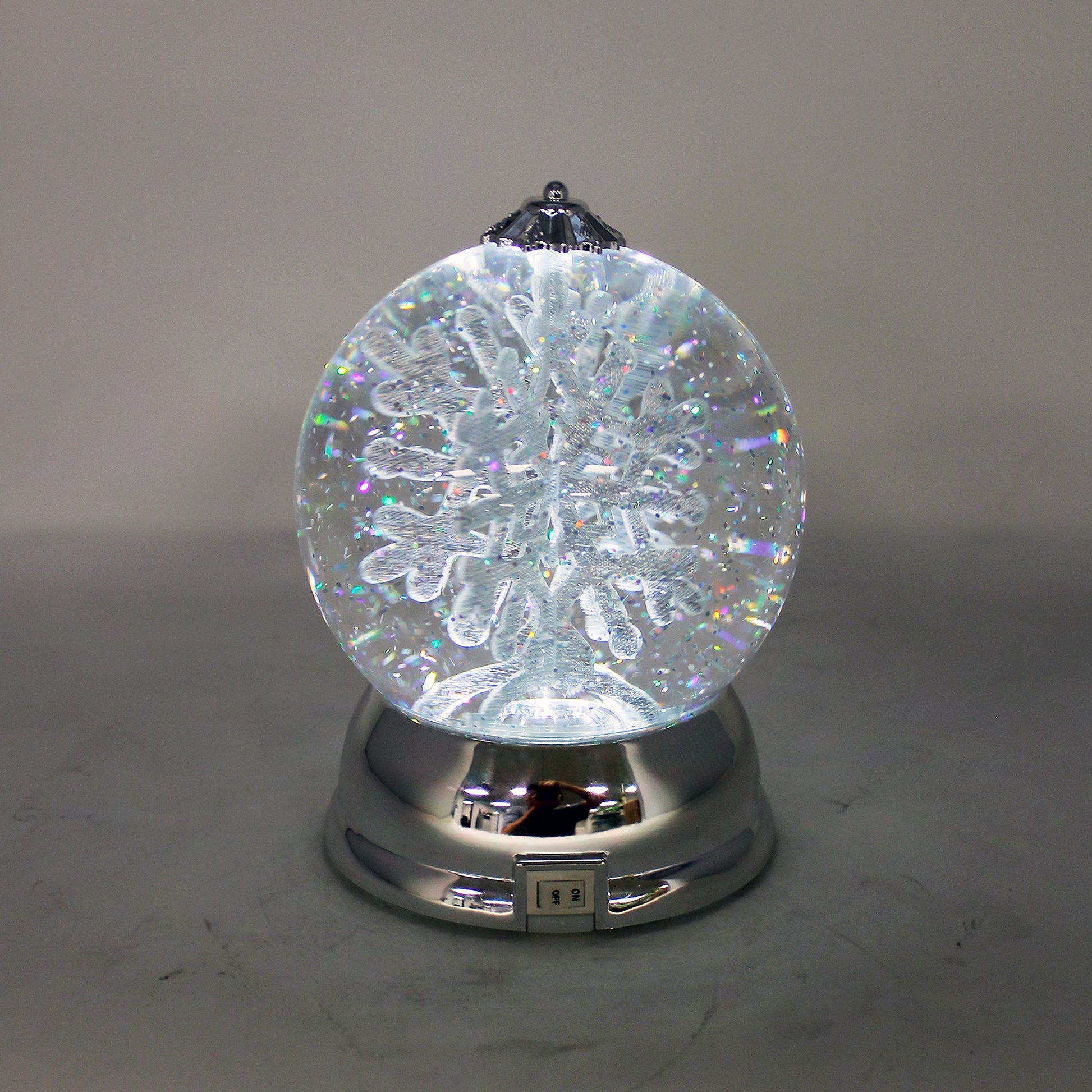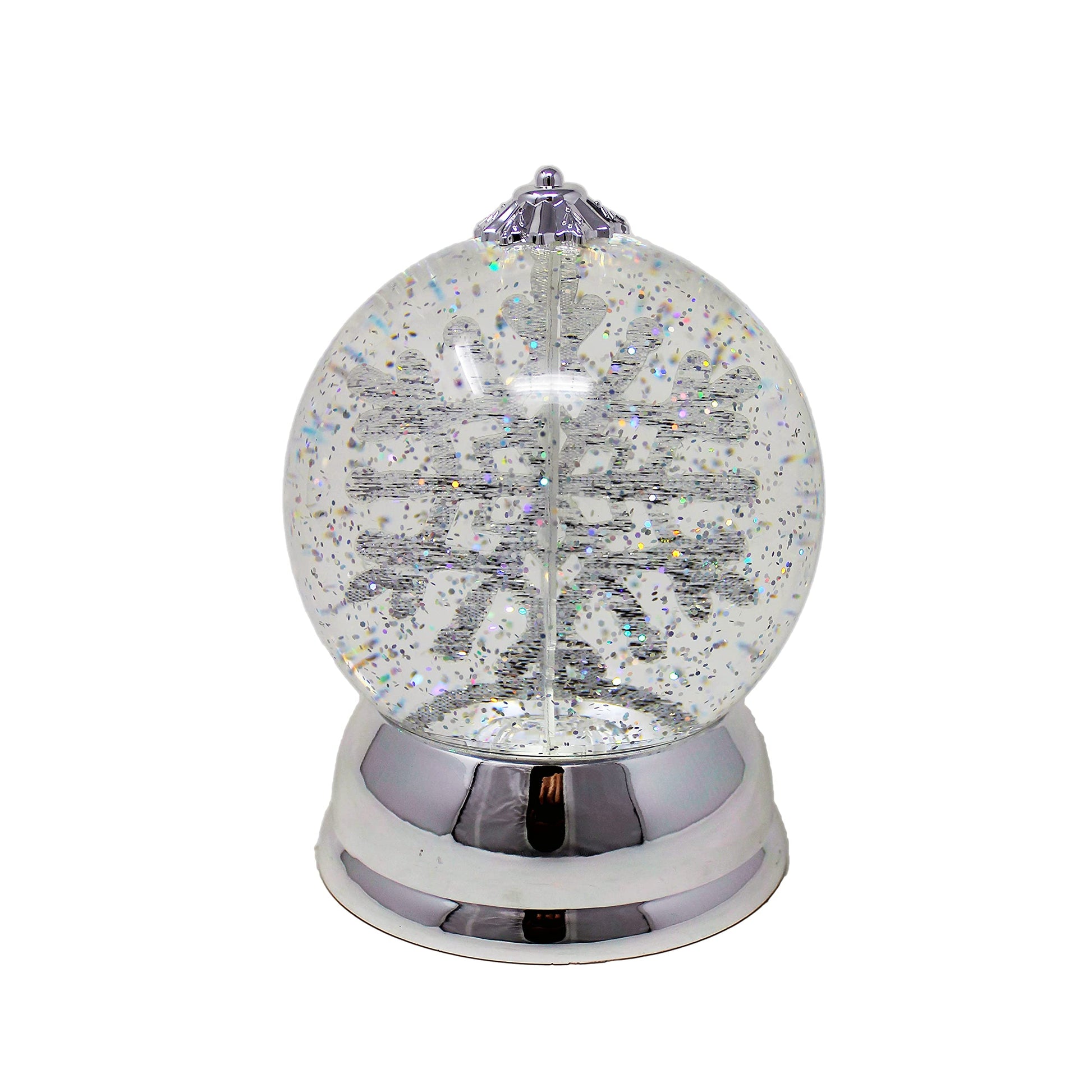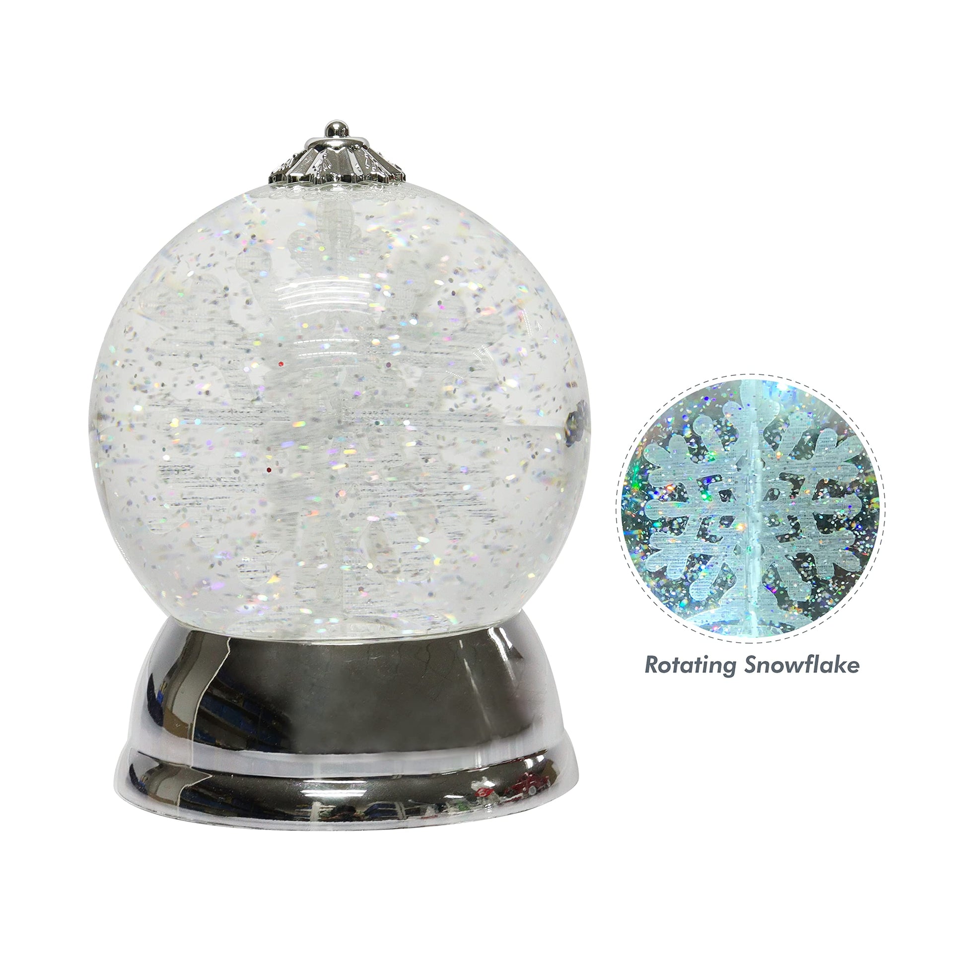 Details: Christmas Decor Lighted Snow Globe with Spinning Snowflake, Battery Operated (not included) - 6.5'H x 4.5'W x 4.5'D