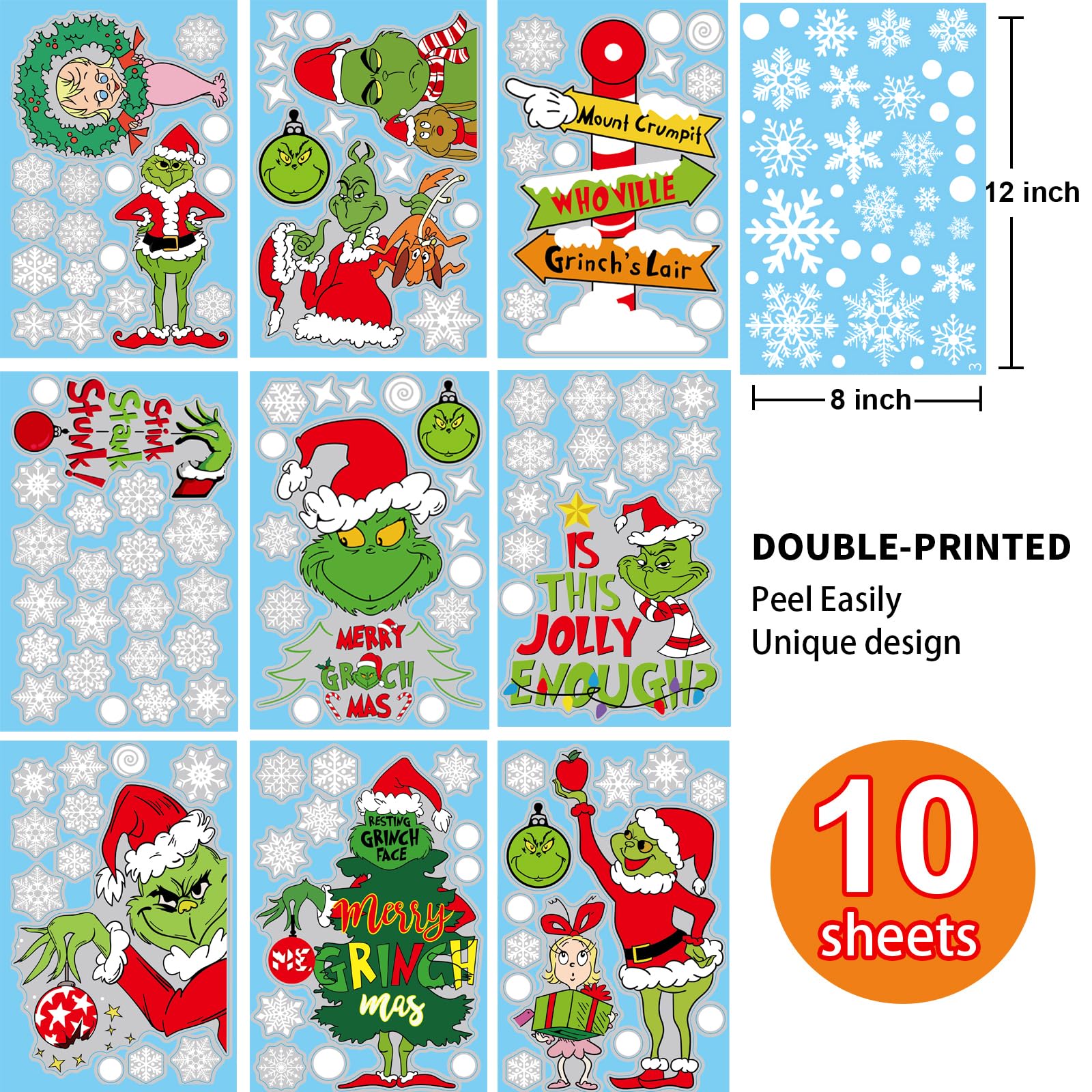 - 🎅10 sheets Chirstmas style window clings :Chirstmas window clings for glass windows include Chirstmas elements, including Santa Claus, snowman, snow.