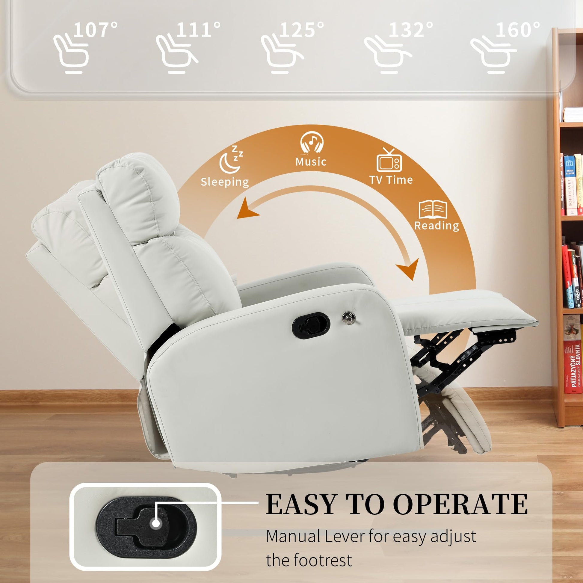 - Durable and easy to clean: This Swivel Faux Leather Recliner Chair is breathable, has no weird smell, and is easy to clean up. This Manual Rocking Recliner Chair has a strong metal frame that can hold up to 300 pounds. It's made to give you lasting comfort and support