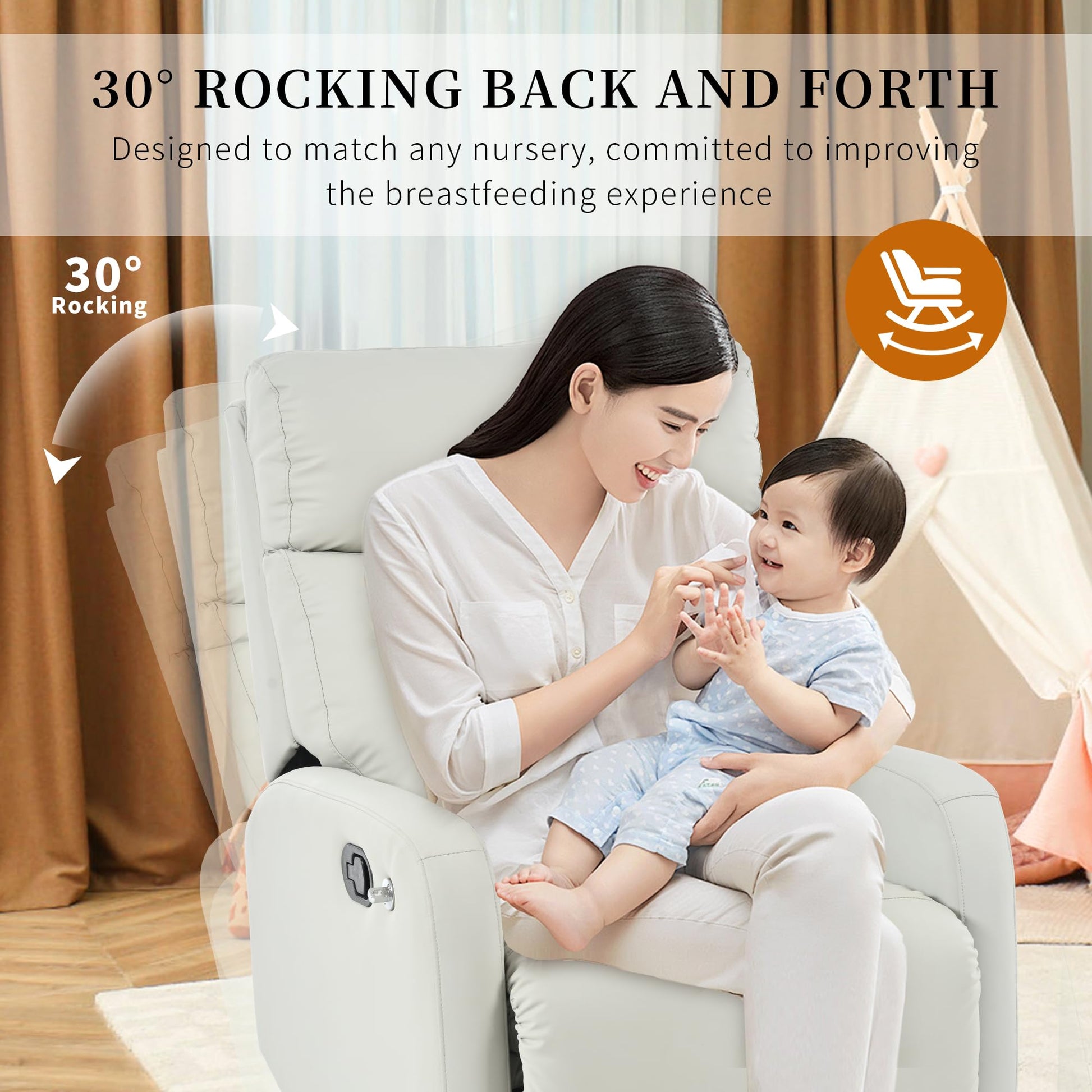 - Multi-scene: This Rocker For Nursery has a wide and comfy seat, and a fully laid-back extended footrest. It's perfect for taking a nap, looking after the baby in the nursery, watching TV or shows in the living room, and reading. The thicker padding in the lower back gives extra support to your lower back and makes you more comfy and relaxed when you're having some leisure time