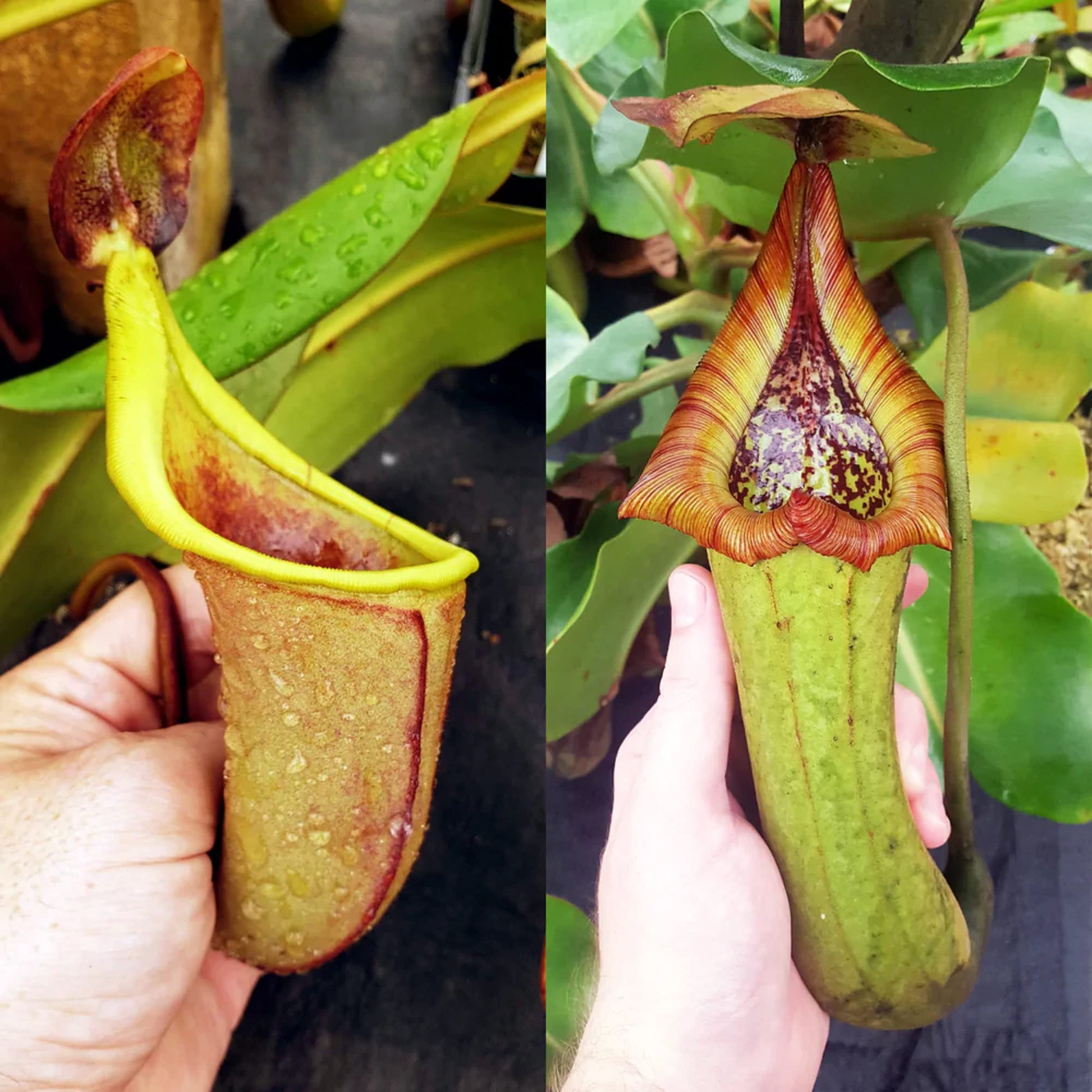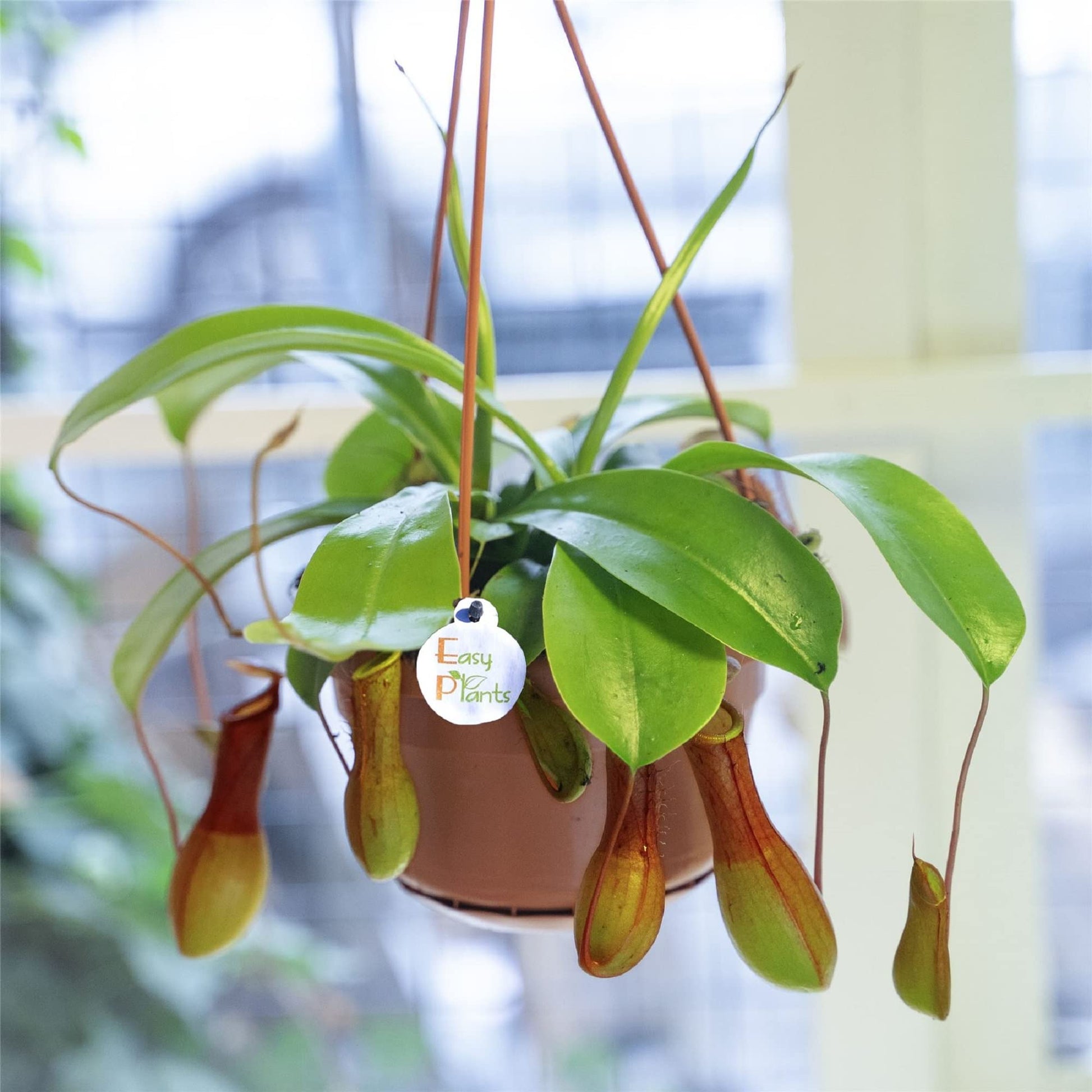 Details: Nepenthes species are perennial herbaceous plants and frequently grow in very acidic soil, though some are epiphytes. All the species are carnivorous plants that capture insects and other prey by means of modified pitcher-shaped leaves that function as passive pitfall traps. When selecting a location for your Nepenthes, you must consider light, temperature, humidity, and space. Most tropical pitcher plants grow in the upper canopy of the rainforest and prefer very bright light, but without much direct sun. Diffused or partial sun is ideal, but high-powered fluorescent lights (such as T5 growlights) can also work well. Spindly leaves and a lack of colouration are signs of insufficient light. Nepenthes do not require a winter dormancy, but the shorter daylight hours will often slow them down over the colder season. Nepenthes are very tolerant when it comes to soil. They enjoy a loose, low-nutrition growing medium which keeps their roots aerated and allows excess water to quickly drain away while still retaining some moisture. Water frequently, keeping the soil damp at all times and never letting it dry out. Unlike many other carnivores, Nepenthes are not bog plants and do not appreciate having waterlogged soil. As such, avoid standing them in water for extended periods, since this will cause root rot.