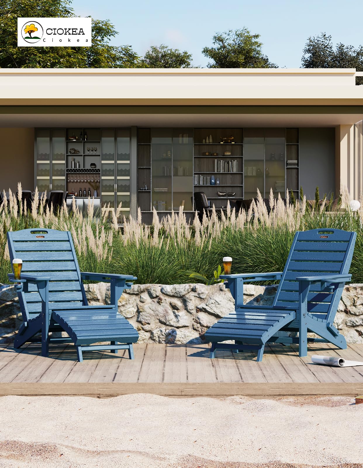 Ciokea Folding Adirondack Chair Set of 2 with Retractable Ottoman Fire Pit Patio Chair with Pull Out Foot Rest Weather Resistant Lawn Outdoor Chair with 2 Cup Holder (Navy Blue)