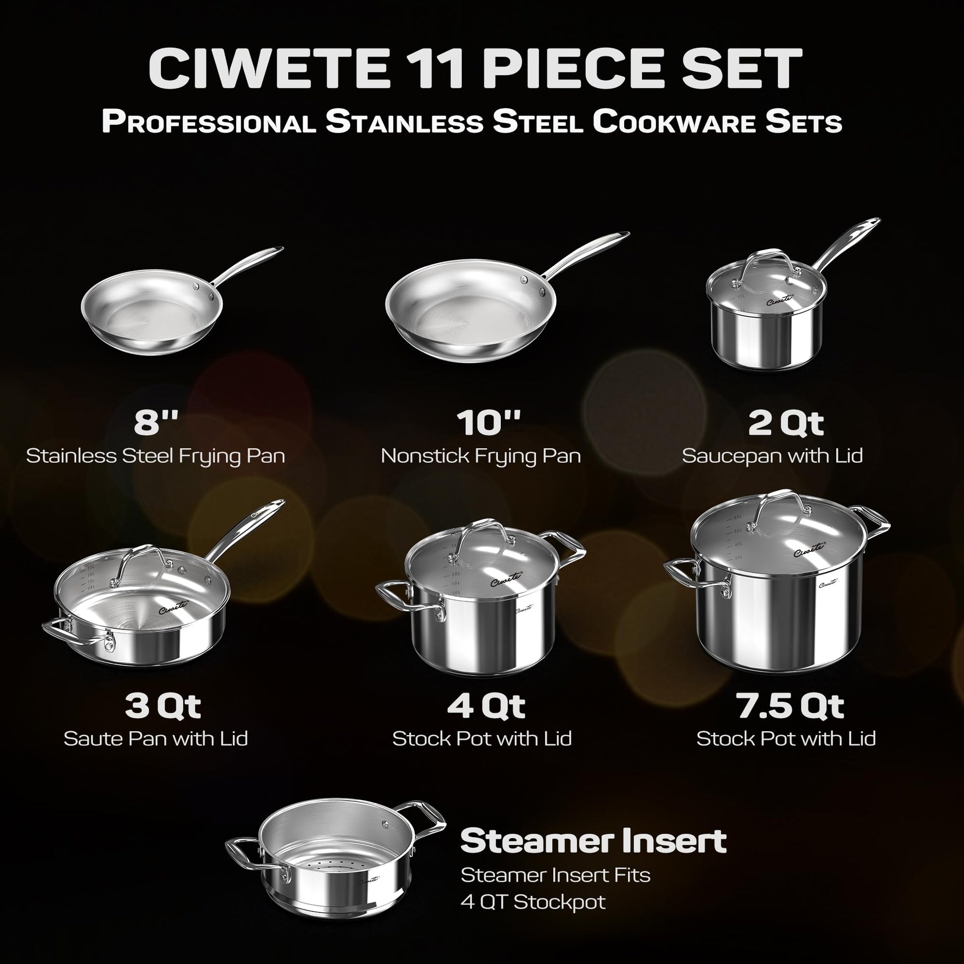 - 【11-Piece Cookware Set】 Complete kitchen set, you can simmer, sauté, fry, boil or braise, show your cooking skills. Including 8-inch steamer insert, 2-quart saucepan with lid, 3.5-quart saucepan with helper handle and lid, 4-quart stockpot with lid, 7.5-quart stockpot with lid, 8-inch frying pan, 10-inch frying pan.