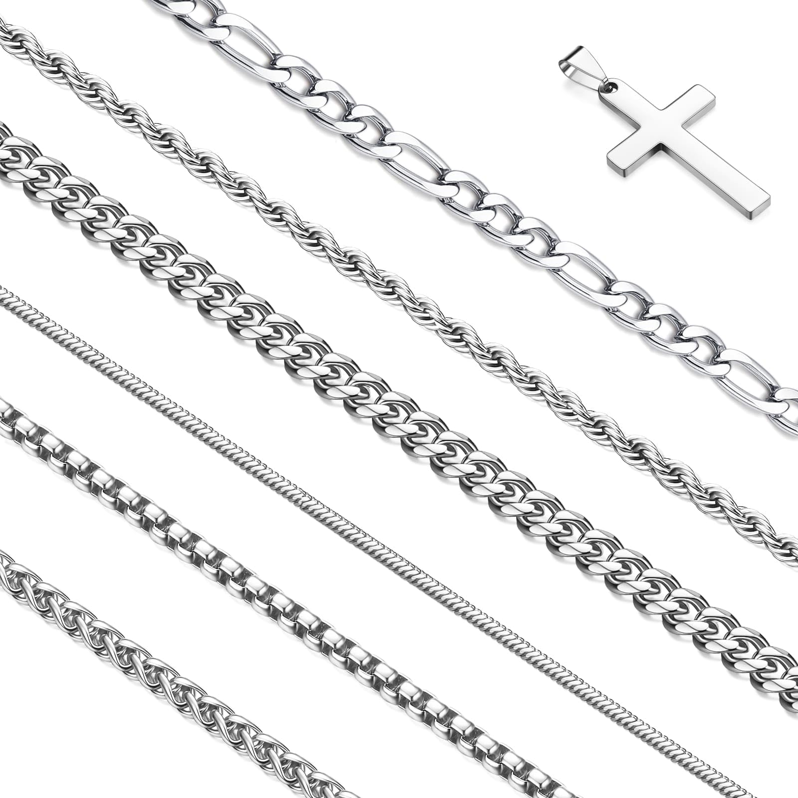 - [What You Get] Get 6 pieces of silver chain for men, including rope chain, figaro chain, cuban link chain, box
