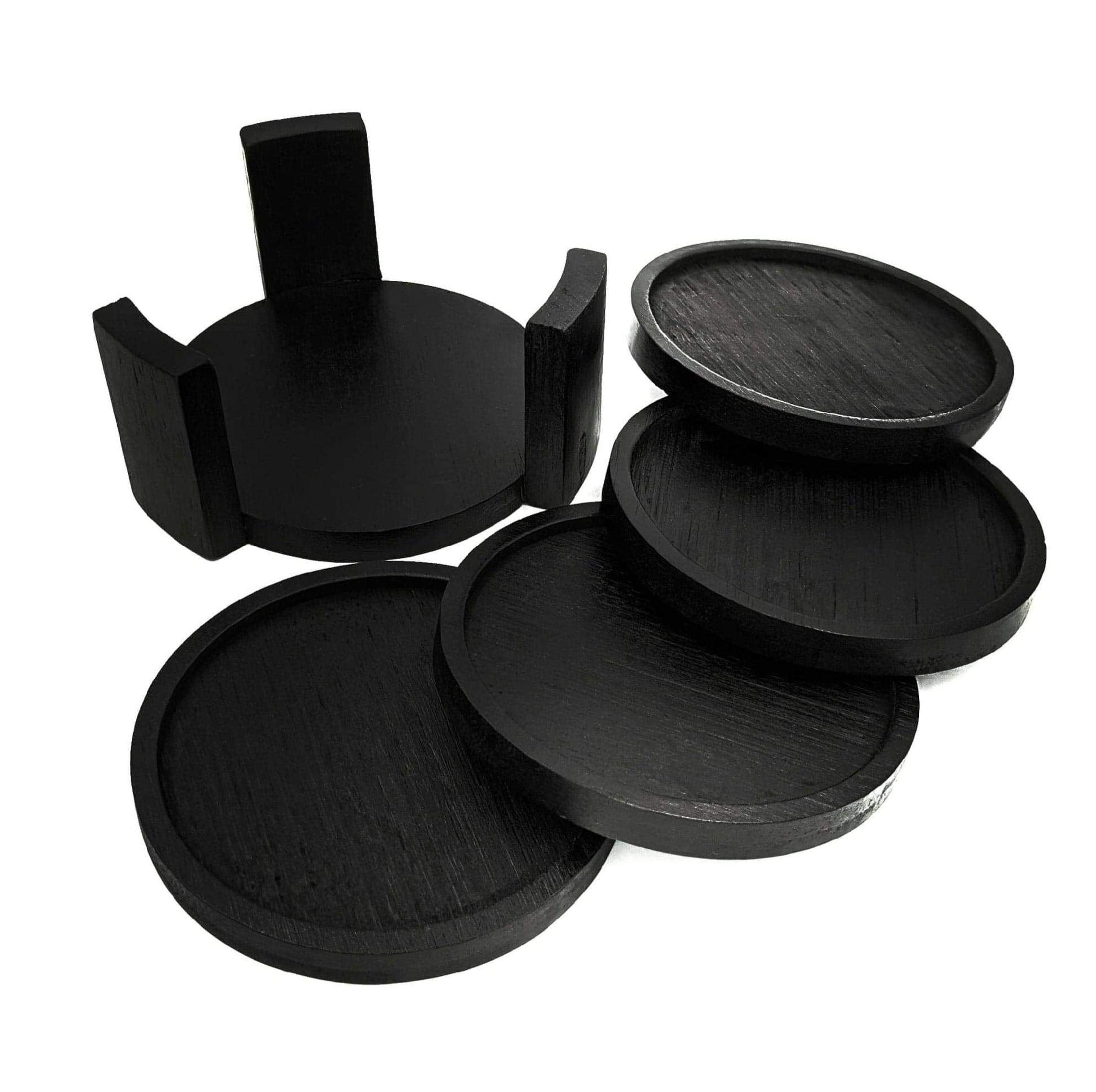 Coaster Set with Holder | Bamboo Wood | Includes 4 Round Coasters and one Holder | Use for Drinks, Beverages, Beer, Coffee! | Barware Kitchen | Housewarming (Black)