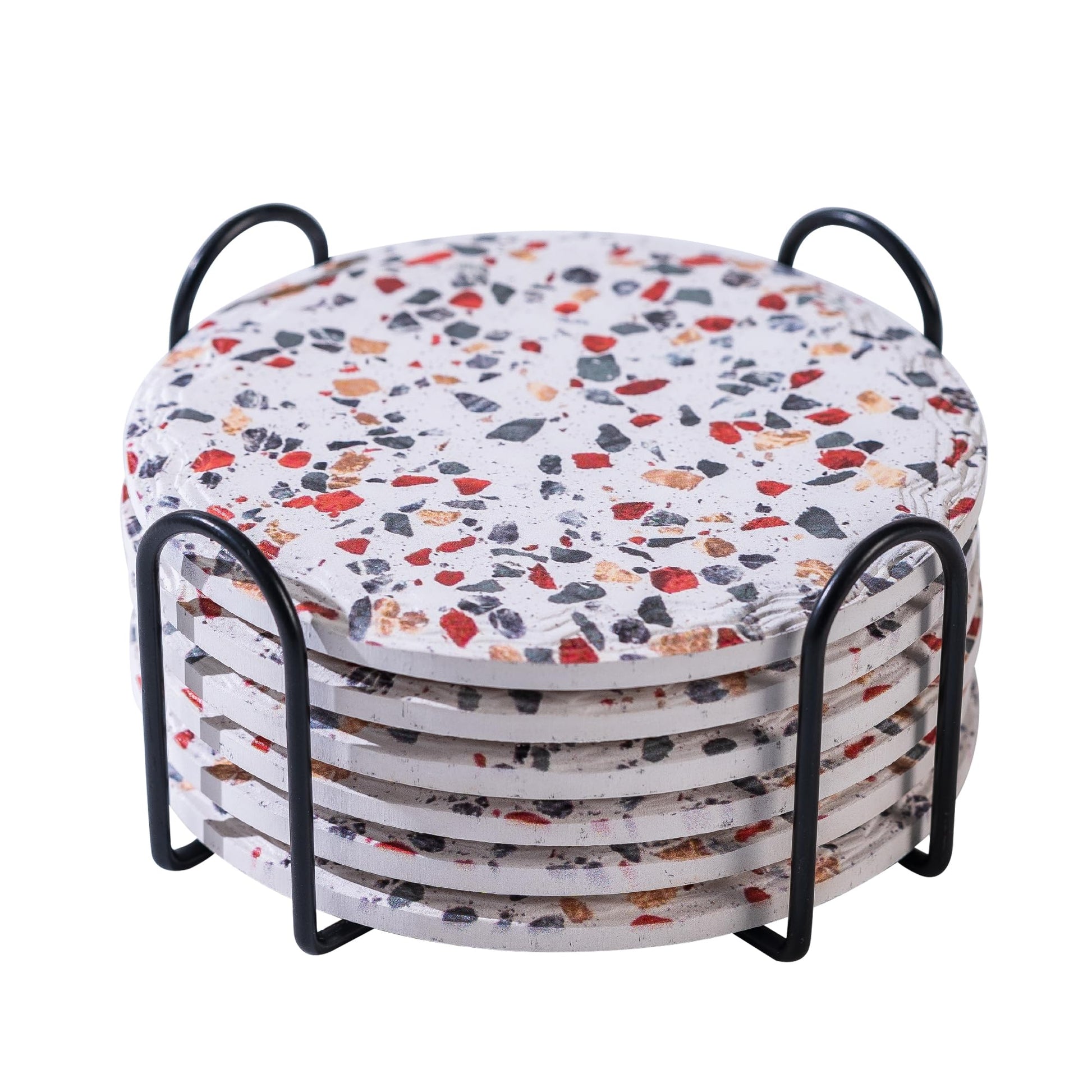 - Coaster set with metal holder: 6 4-inch round ceramic coasters and a black metal coaster holde