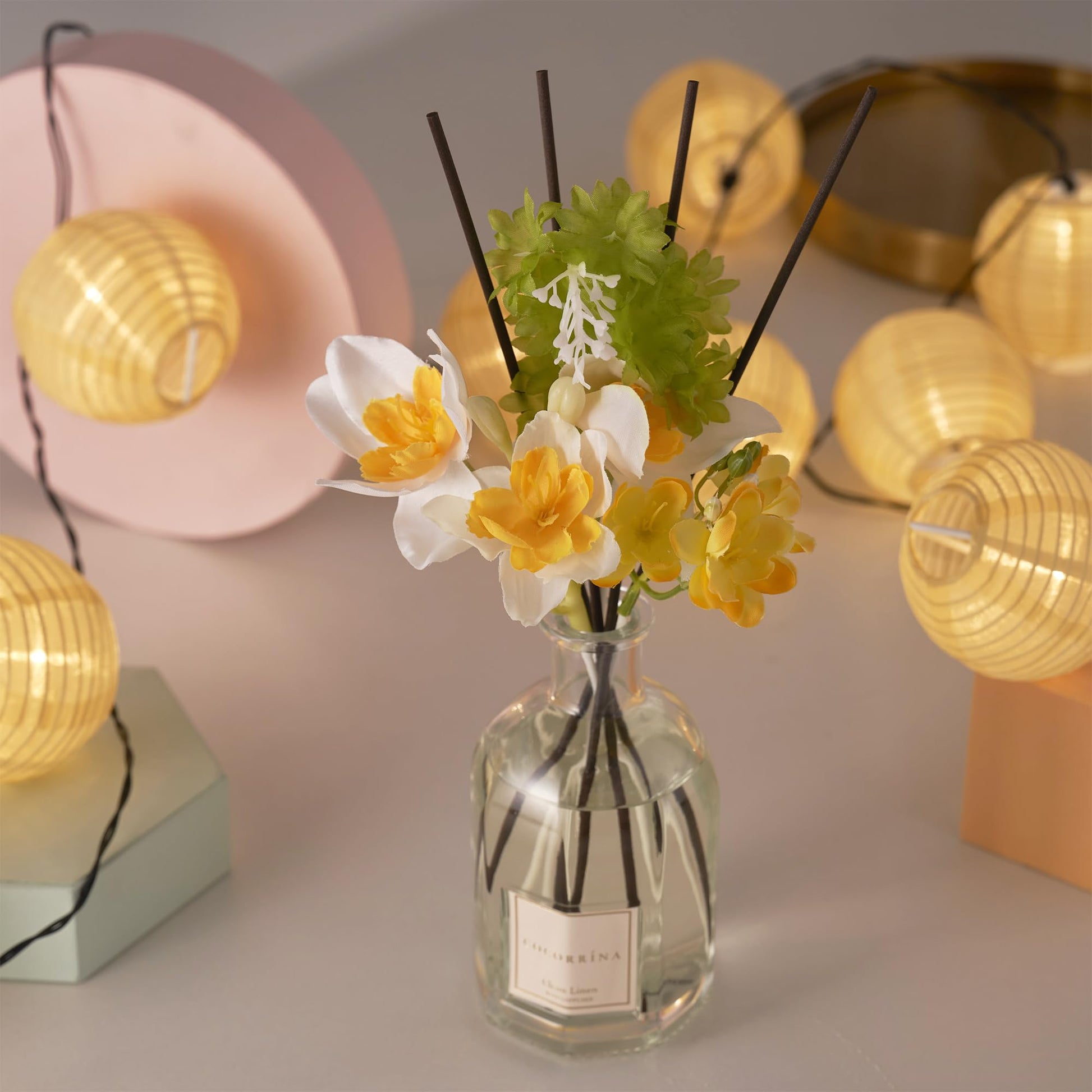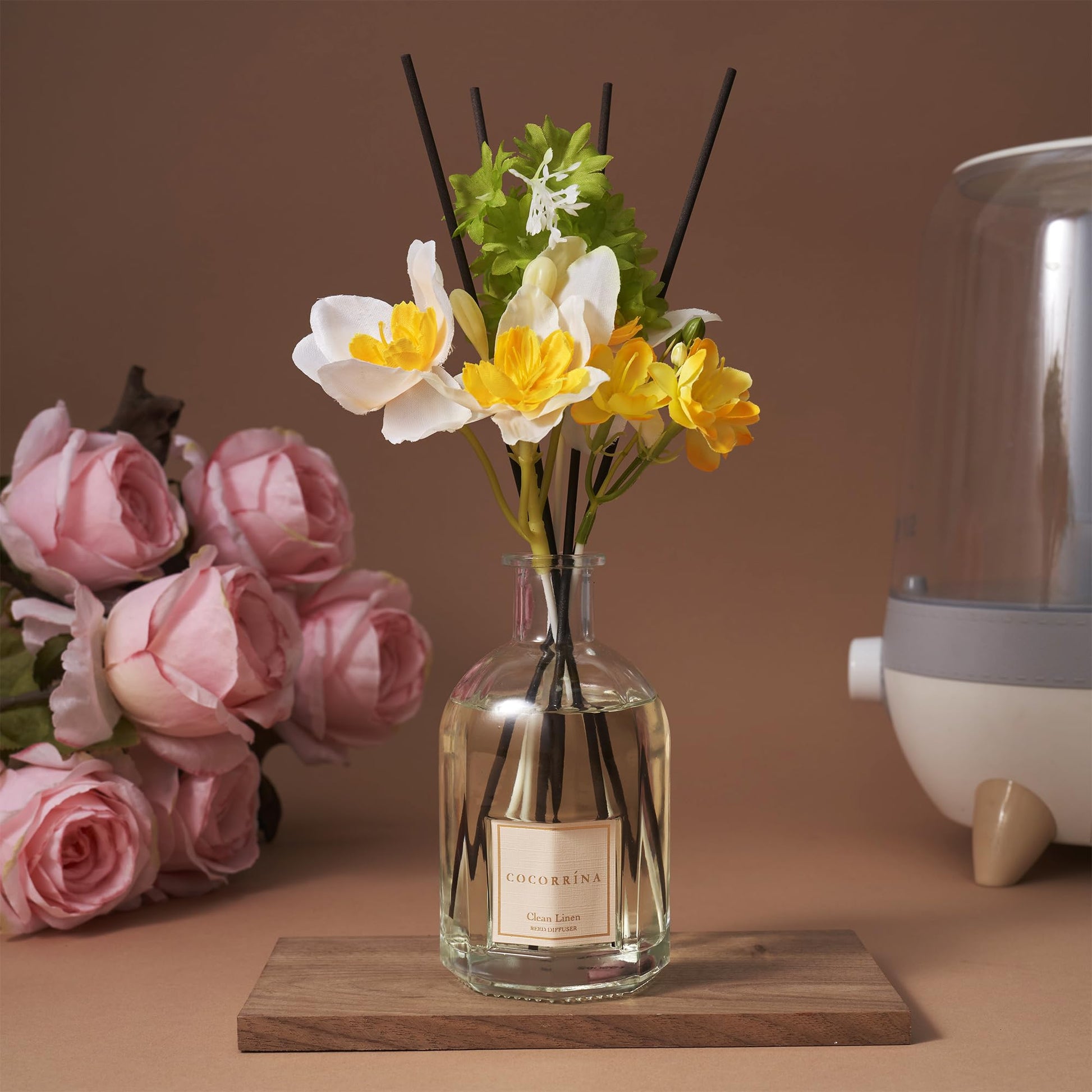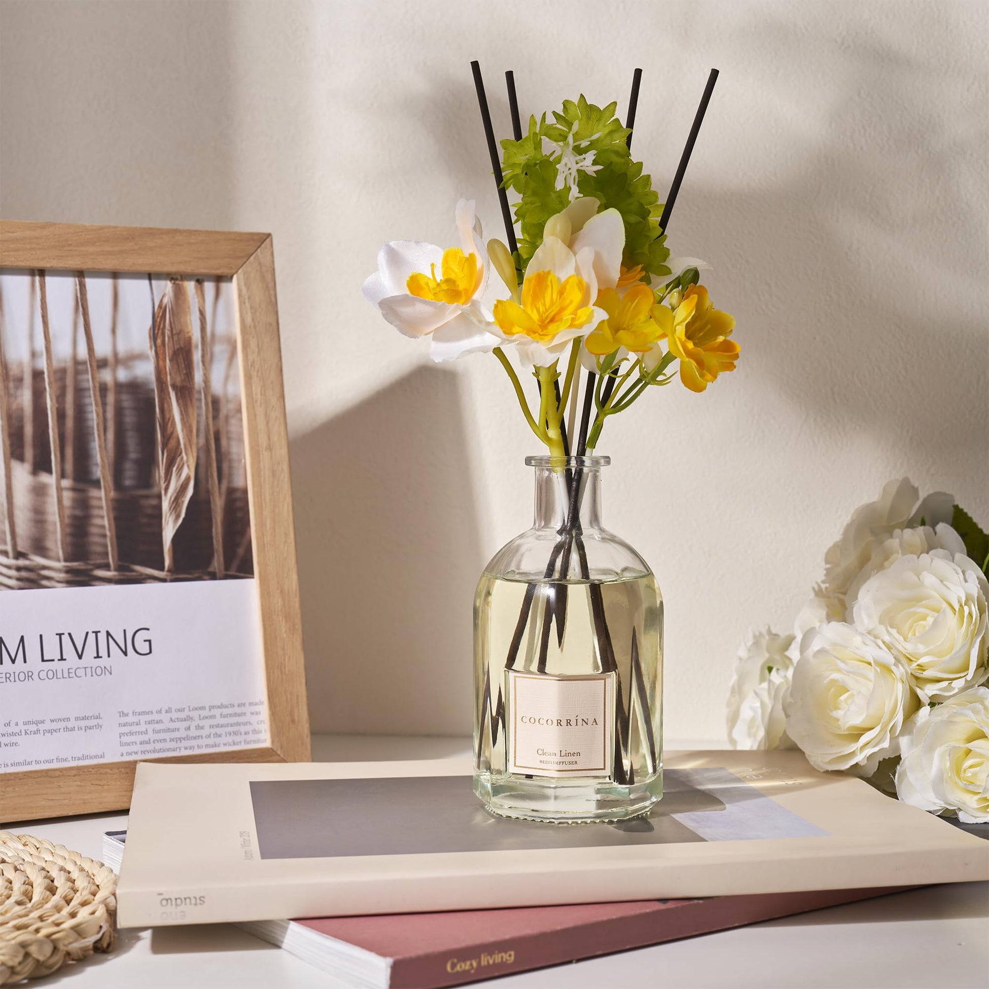 COCORRÍNA Reed Diffuser - Clean Linen 8.5 Fl.oz/ 250ml Flower Diffuser with 8 Sticks, Reed Diffusers for Home Bathroom Shelf Decor (Botanical Flower Collection)
