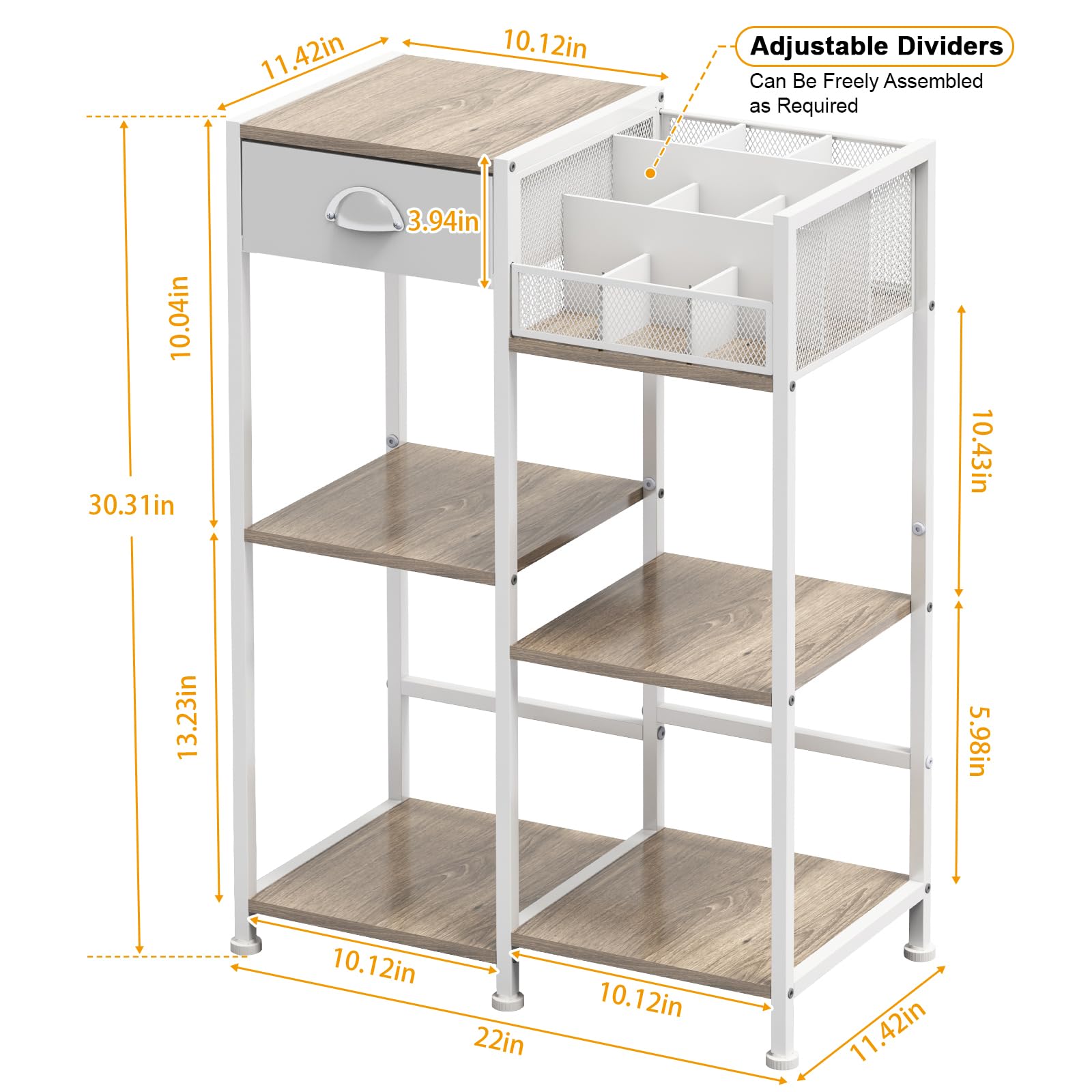 - 【Canvas Drawer & Open Shelf】The drawer provides ample storage for like K-cups, tea bags, coffee scoops, paper cups, sugar packets, and other coffee accessories. Five open shelves give you space for a variety of storage needs for storing coffee machines, coffee makers, sandwich maker, bagged or canned goods, etc.