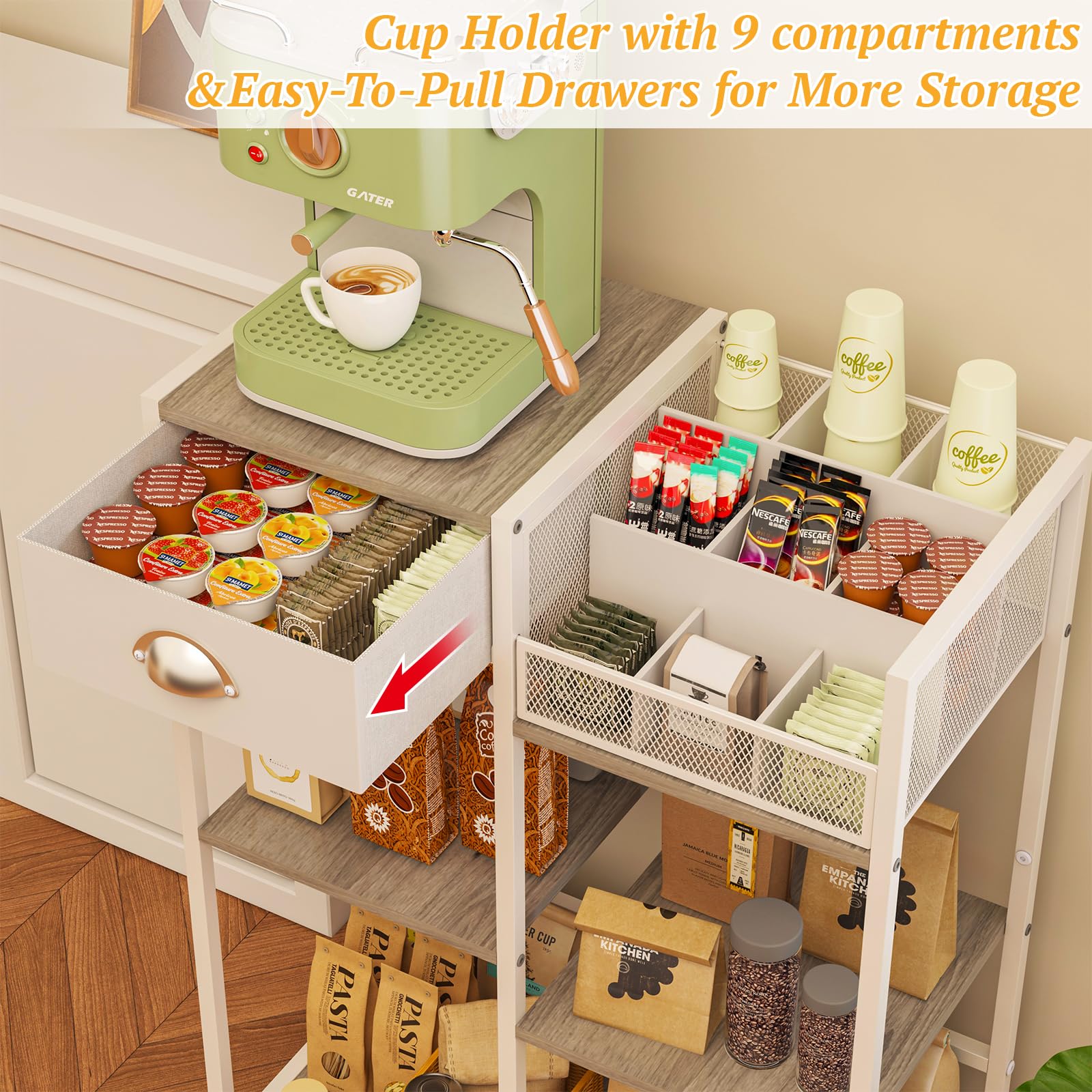 Coffee Bar Station with Drawer, 6 Tier Coffee Table with Dividers for Organizing, 3 Tier White Storage Stand for Living Room/Kitchen/Bathroom