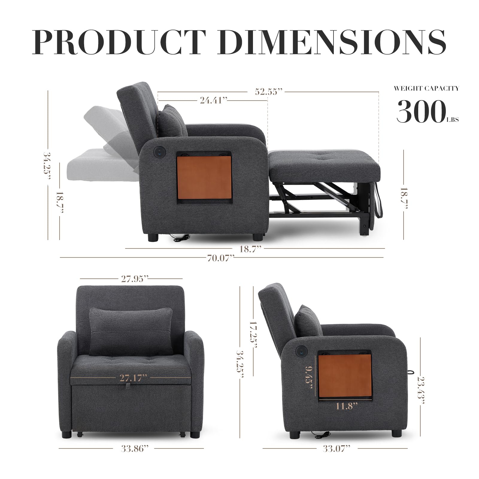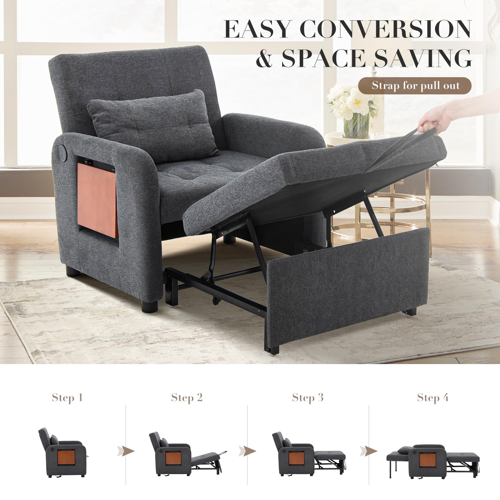 COLAMY Convertible Sleeper Chair-Fabric Futon Sofa Bed, Single Sleeper Sofa, Small Couch Bed with USB Port, Foldable Table, Pillow, Adjustable Backrest for Dorm/Bedroom/College Darkgrey
