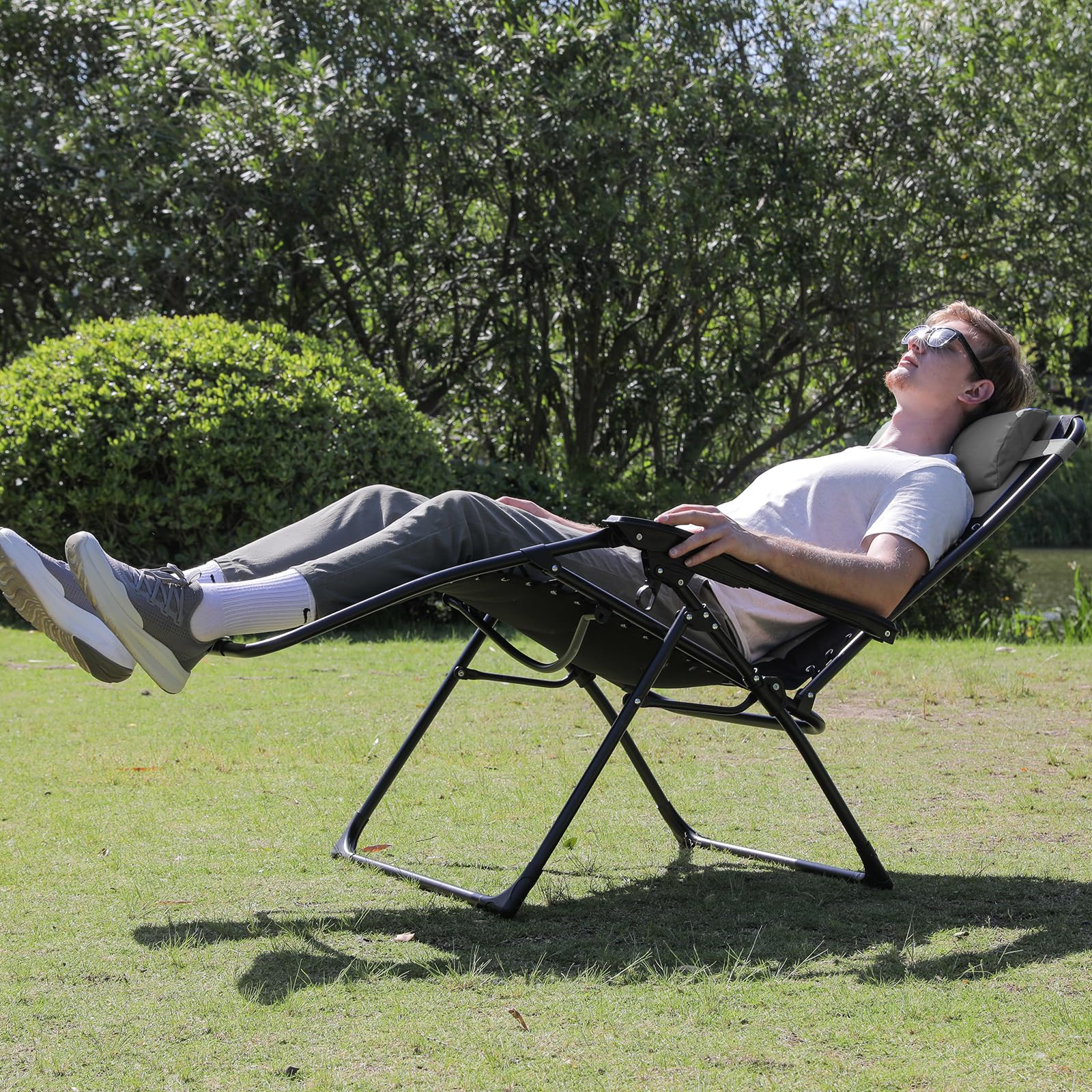 - 【Oversized Seat & 350 Lbs Weight Capacity】Our anti gravity chair is designed to provide with a spacious seat outdoors. The combination of the core part of the 3-strand braided bungee suspension system, high-density 600D oxford fabric, and heavy-duty steel frame with 1.5mm tube walls (50% thicker than ordinary products) makes the recliner outdoor chair has a strong construction to withstand the max weight of 350lbs, which is more than twice of a regular people